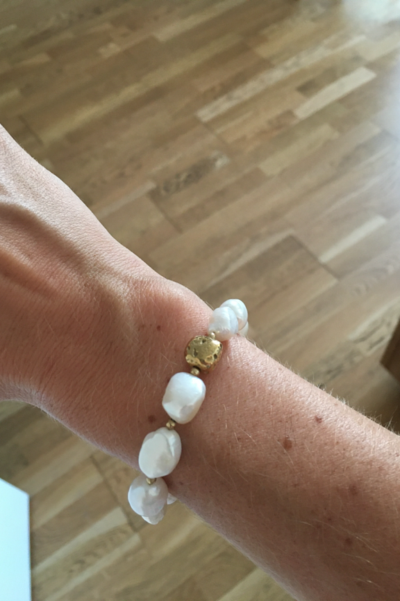 โข Bracelet rรฉglable composรฉ d'un joli enfilage de perles en perles d'eau douce et d'une perle dorรฉe martelรฉe โข Dimensions : 15,5 + 3 cm โข Hypoallergรฉnique, ce bijou rรฉsiste ร l'eau et ne noircit pas