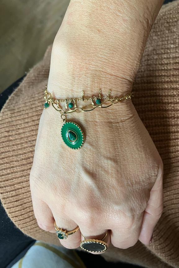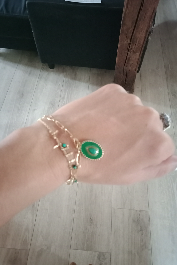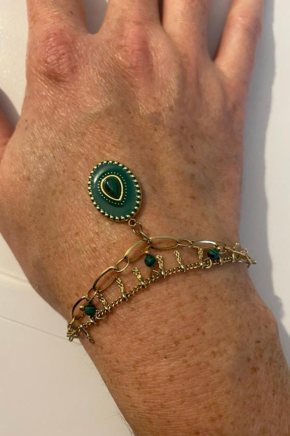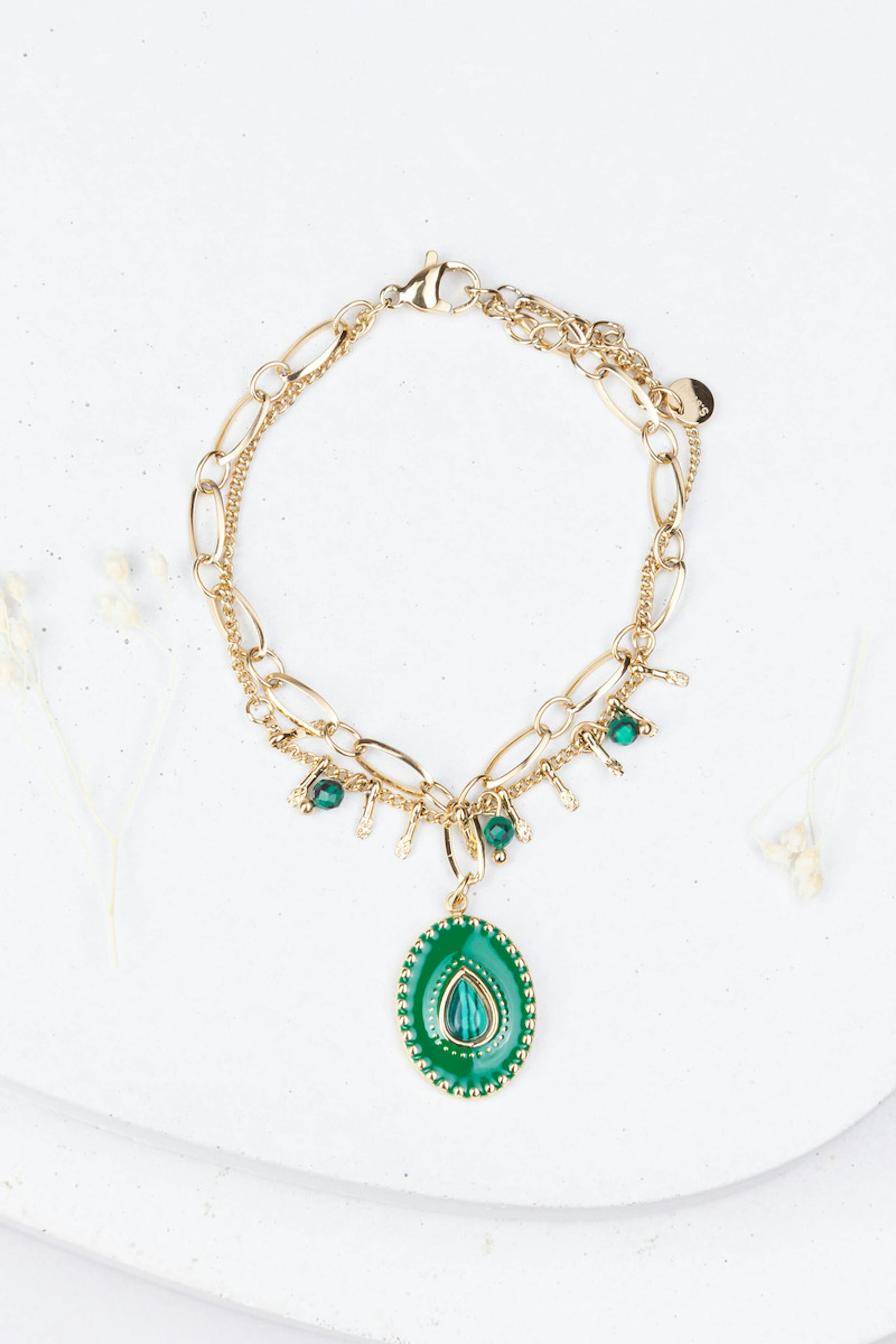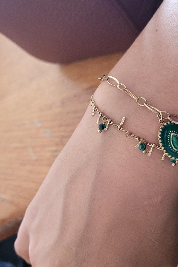 โข Bracelet sur chaรฎne rรฉglable 2 rangs avec une chaine embellie de perles en pierres naturelles et un pendant au motif รฉmaillรฉ, colorรฉ et embelli de pierre naturelle โข Fermoir mousqueton et chainette de rรฉglage โข Dimensions : 15 + 3 cm โข Matiรจre : Acier inoxydable โข Hypoallergรฉnique, ce bijou rรฉsiste ร l'eau et ne noircit pas