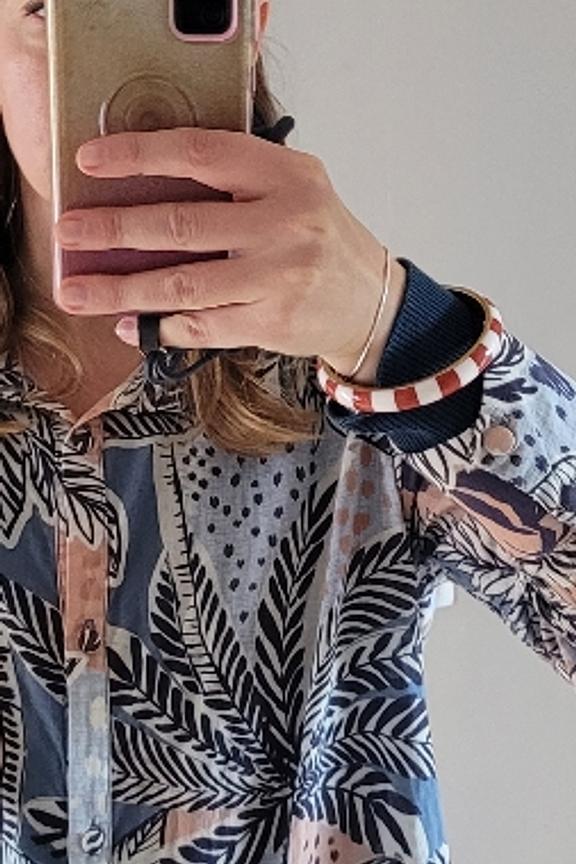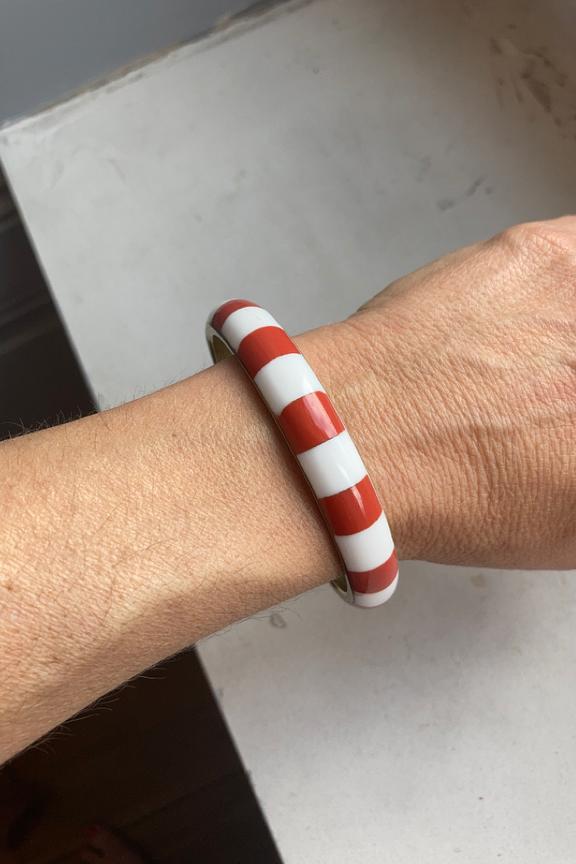 • Jonc fin en métal doré, rayures en acétate de couleur • Finition brillante • Ce bracelet s'enfile et existe en taille unique • Largeur: 1cm - Ø : 6.5cm