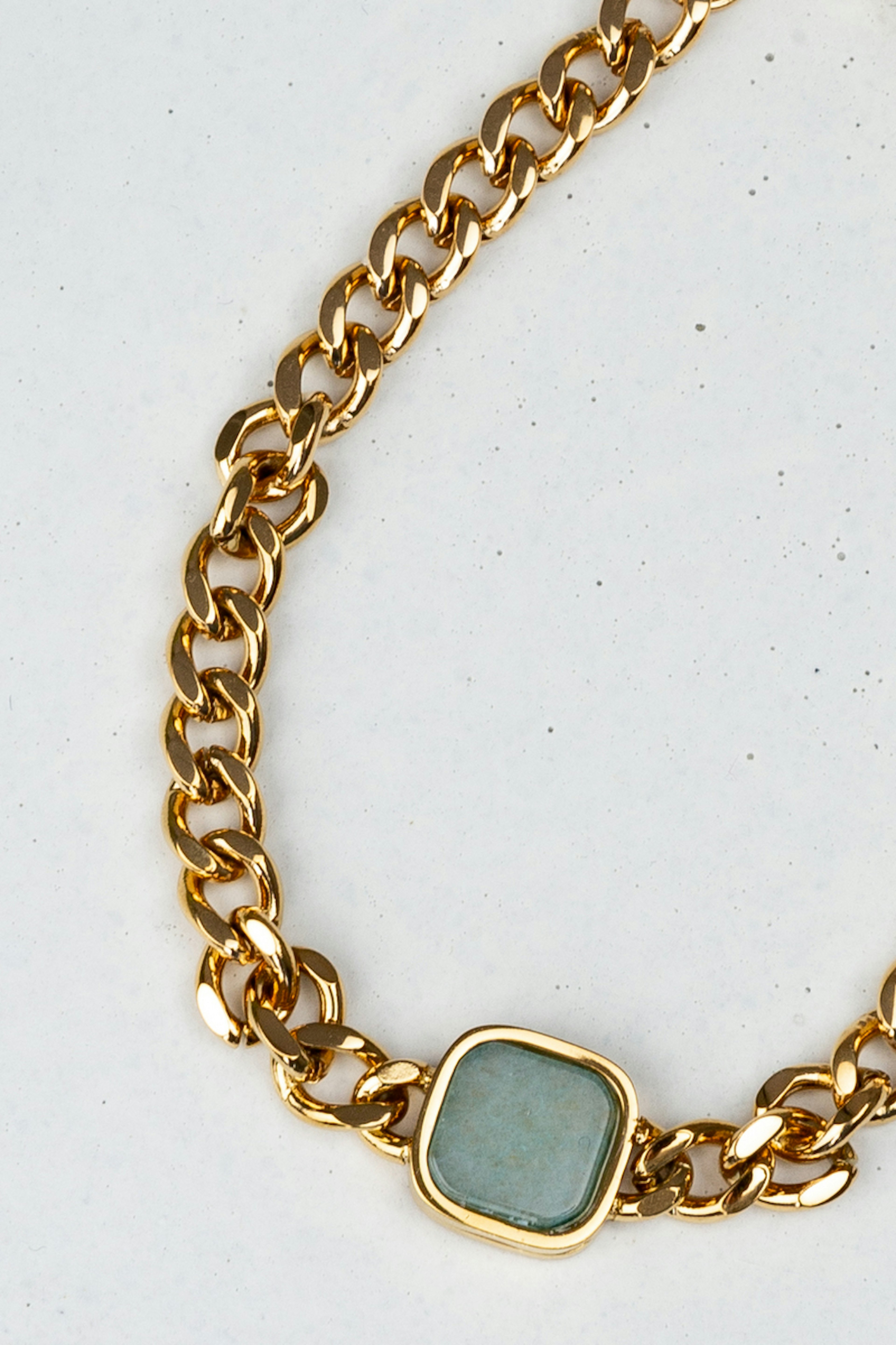 โข Bracelet sur chaine rรฉglable en maille et une piรจce centrale sertie de pierre naturelle ou pate de verre effet nacre โข Fermoir mousqueton et chainette de rรฉglage โข Pierre naturelle : Amazonite โข Dimensions : 16,5+3 cm โข Hypoallergรฉnique, ce bijou rรฉsiste ร l'eau et ne noircit pas