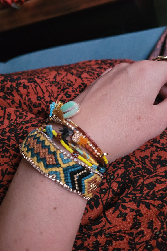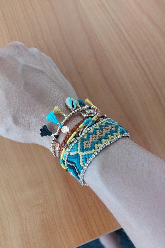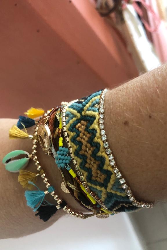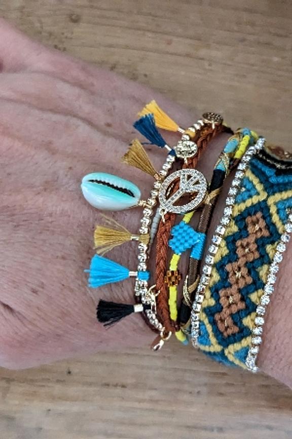Bracelet multilien Hipanema. Il est composรฉ de six liens multicolores. On retrouve un bracelet brรฉsilien typique ornรฉ de part et dโautre de chaรฎnes strassรฉes effet diamant, un sigle Peace and love strassรฉ. Chaรฎne, fermoir et pampilles en laiton argentรฉ