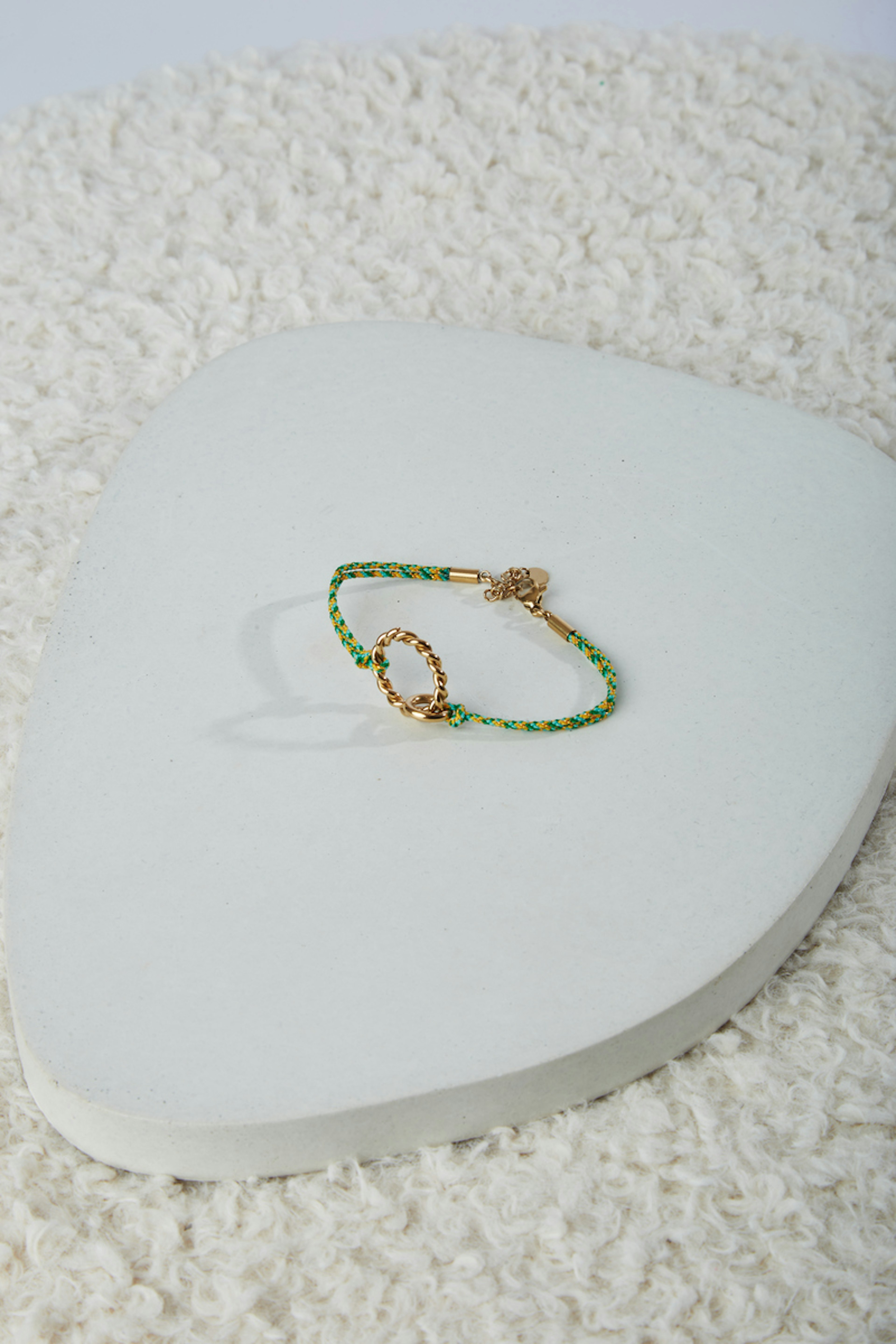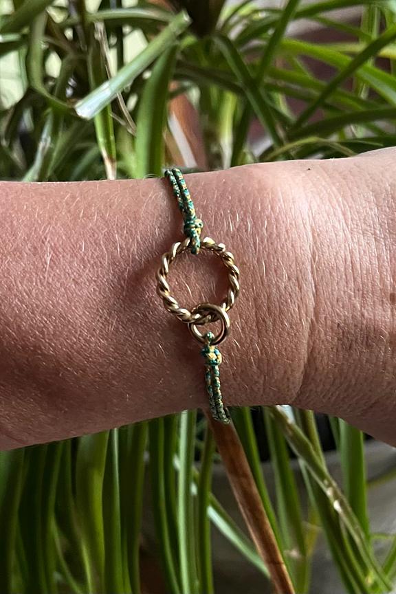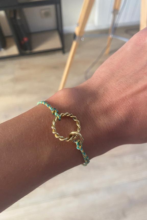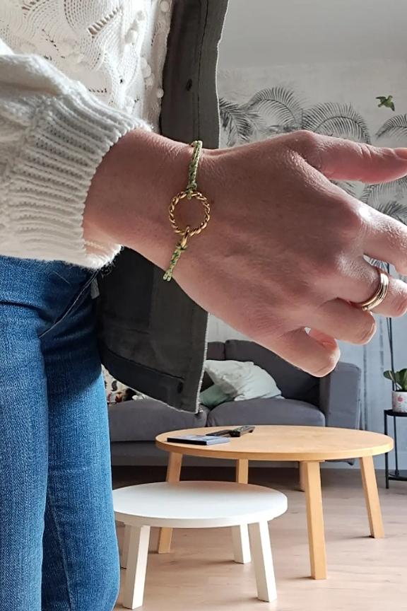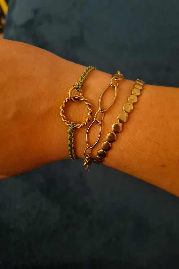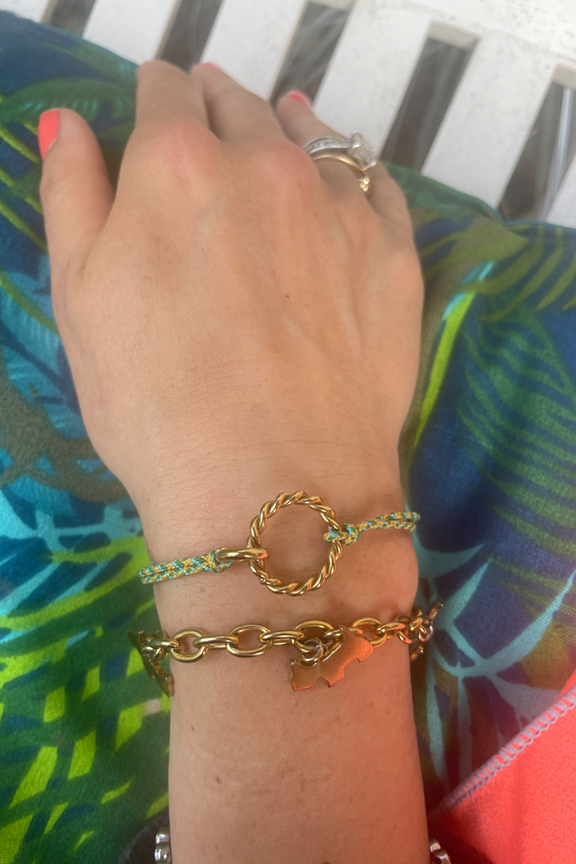 โข Bracelet colorรฉ tressรฉ et dรฉcorรฉ de deux anneaux dorรฉs entrelacรฉs โข Conรงu en acier inoxydable
