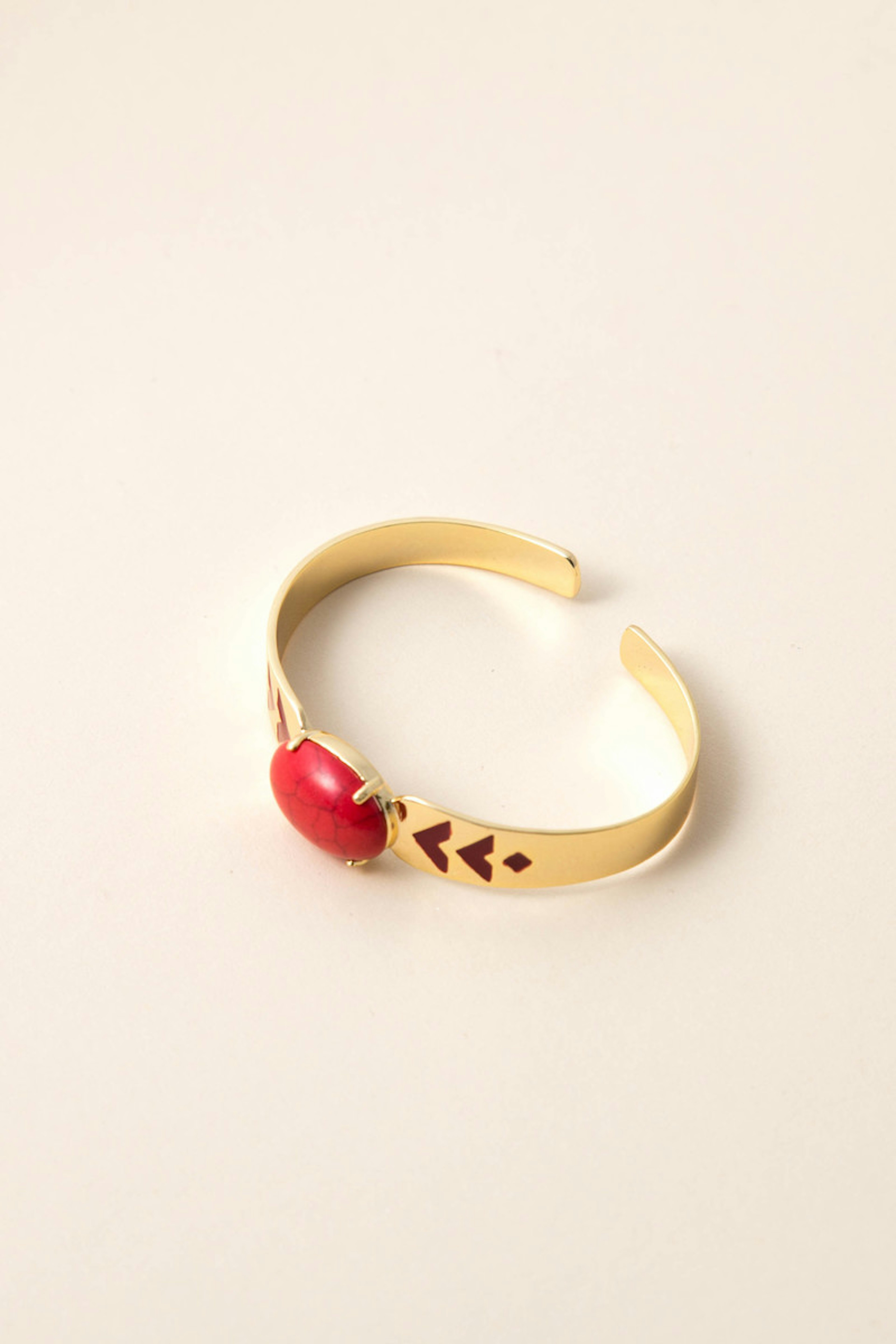 Le bracelet Rosso est une jolie manchette dorรฉe. Le modรจle est rรฉglable. On retrouve au centre une large pierre de couleur rouge et de chaque cรดtรฉ des incrustations ethniques du mรชme rouge.