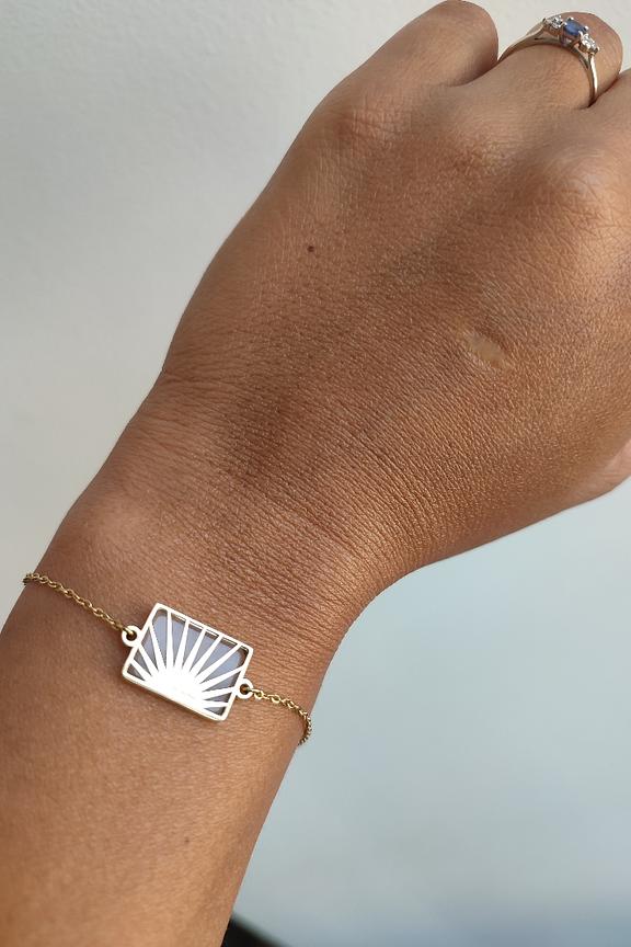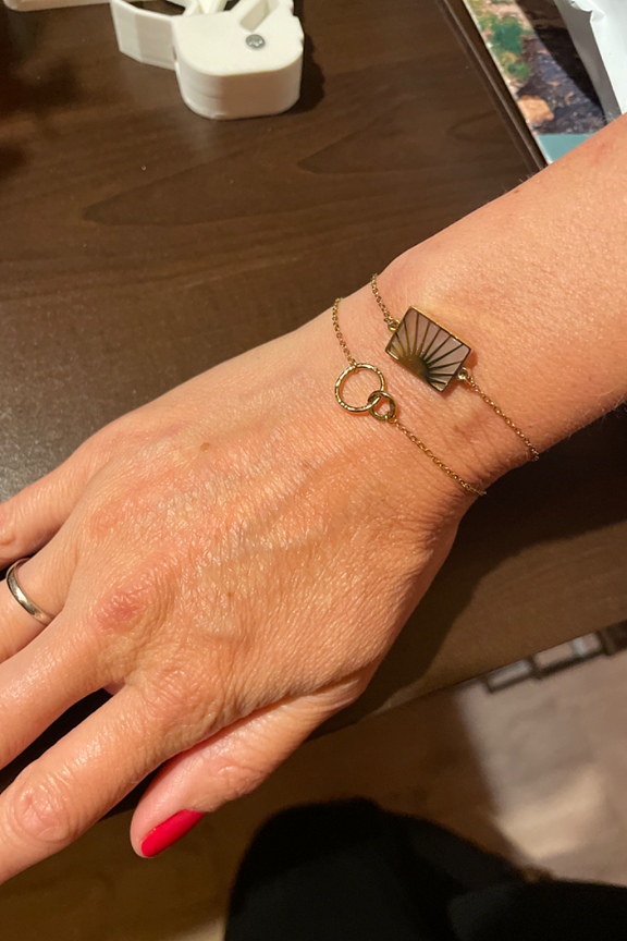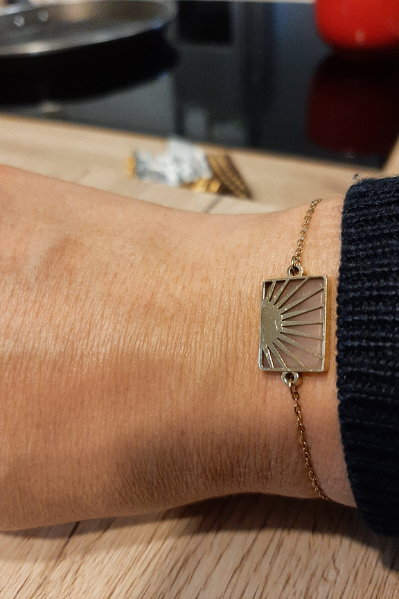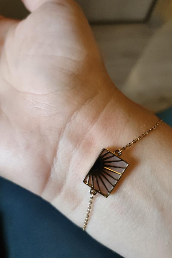 Bracelet en acier inoxydable composรฉ d'un mรฉdaillon rectangulaire en pierre naturelle et d'un motif auroral. Ce bracelet est rรฉversible, l'autre facette prรฉsente uniquement la pierre naturelle. โข Longueur de la chaรฎne : 16,5cm โข Longueur de la chaรฎne de rรฉglette: 3cm โข Longueur totale du bracelet : 19 cm โข Dimensions du mรฉdaillon : 10 x 14 mm โข Garantie sans nickel, sans cadmium, sans sel de plomb. โข Rรฉsiste ร lโeau et ne noircit pas.