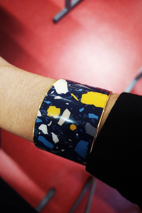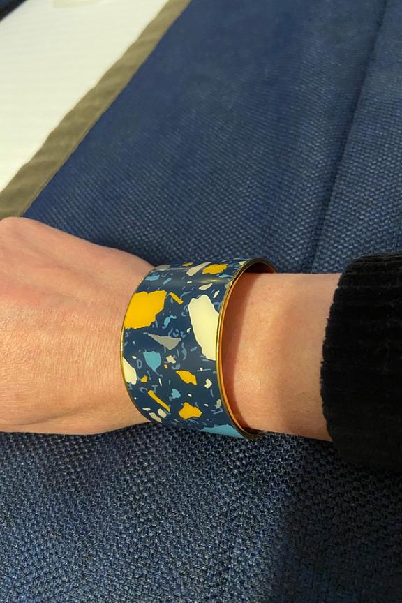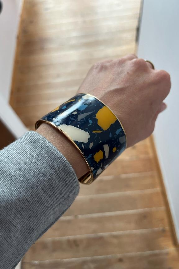La manchette Terrazzo couleur Bleu Nuit, est idรฉale pour celles qui recherchent lโ€™originalitรฉ tout en sobriรฉtรฉ. โ€ข Manchette de 4 cm de largeur trempรฉe dans un bain dโ€™or โ€ข Forme semi-ouverte et ajustable โ€ข Diamรจtre de la manchette : 6 cm (que l'on peut resserrer ou desserrer en effectuant une lรฉgรจre pression)