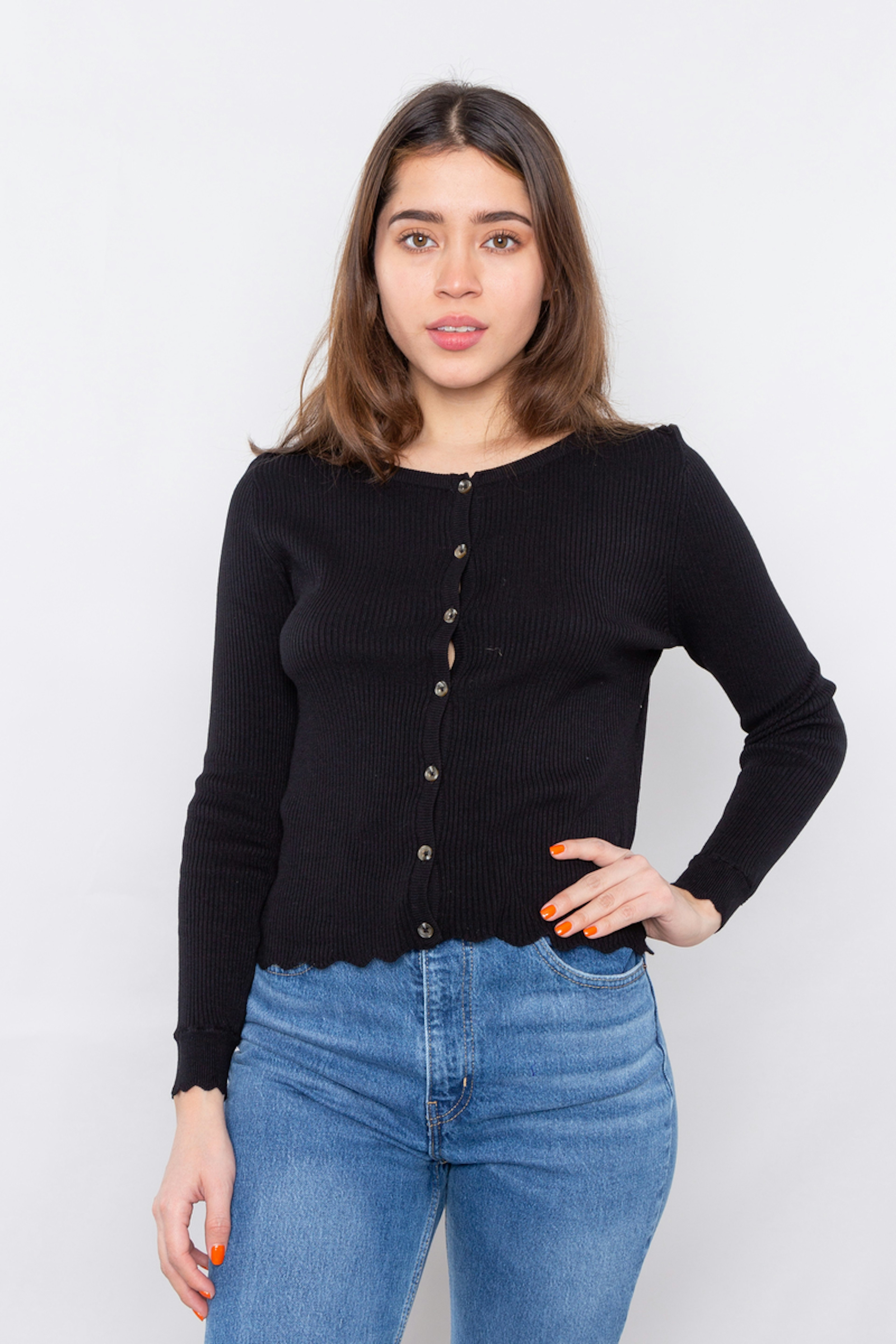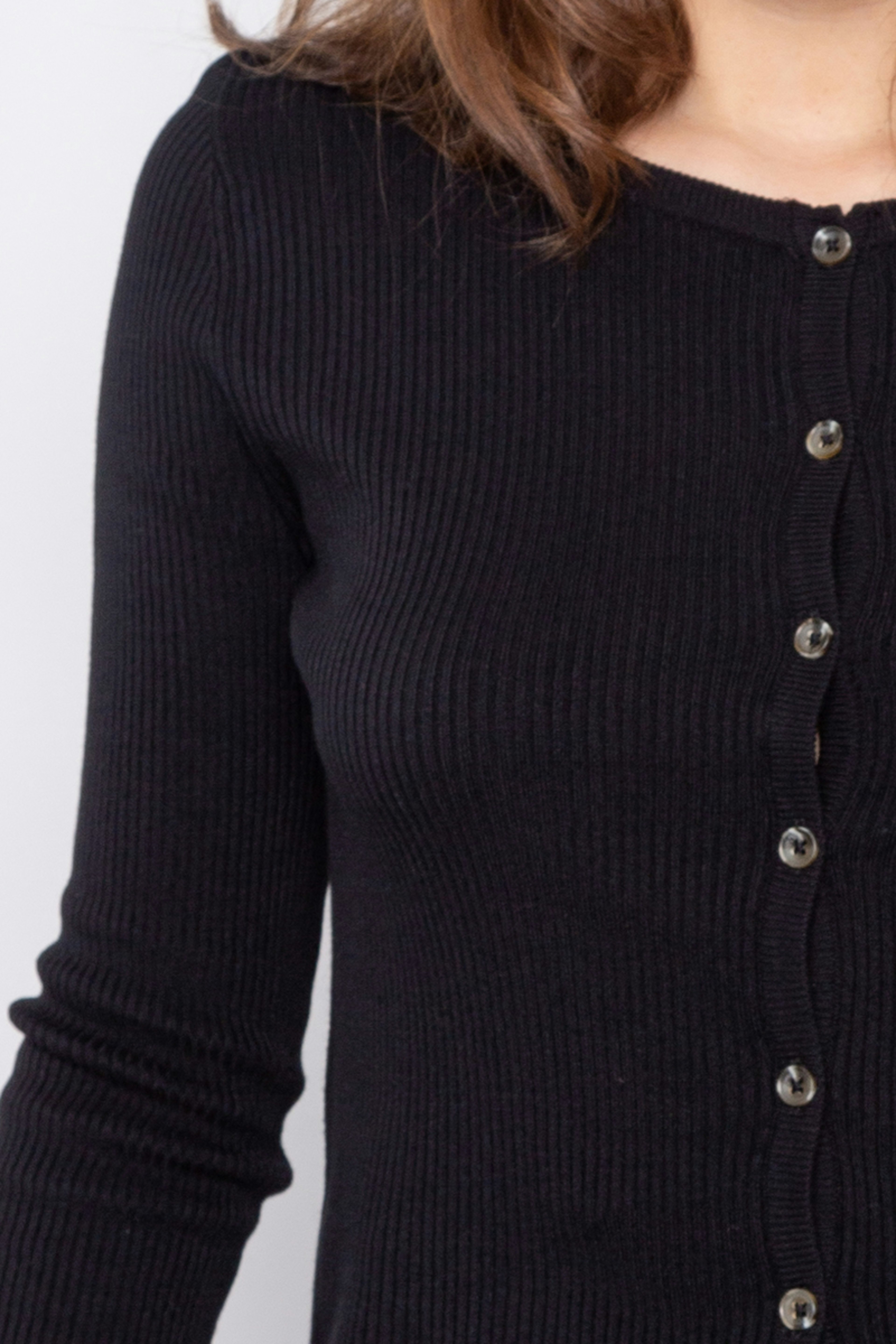 โข Gilet noir โข Bords fantaisie en bas de manches et de la taille โข Manches longues โข Patte de boutonnage