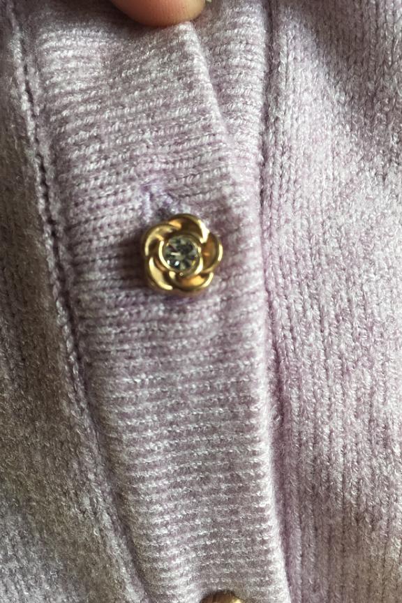 โข Cardigan couleur lilas โข Boutons fantaisie โข Manche mi-longues โข Patte de boutonnage โข Coupe croppรฉe