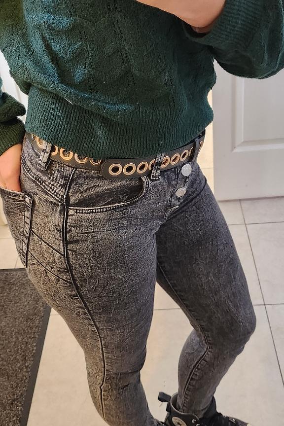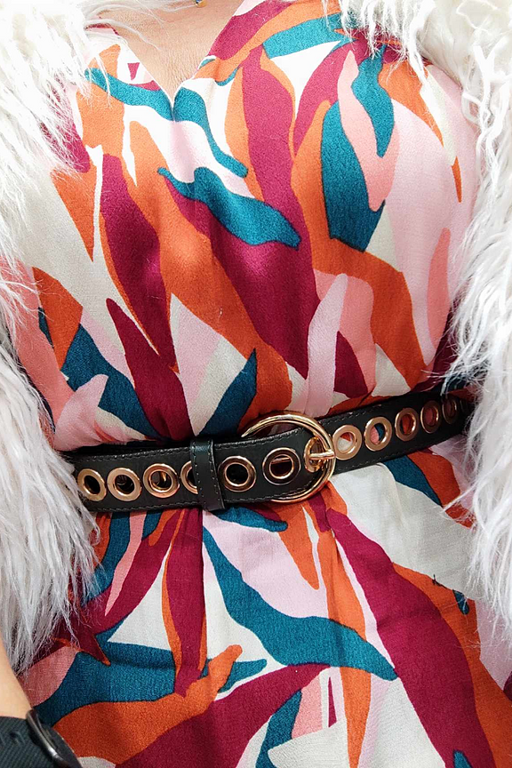 โข Ceinture fine en cuir noire โข Dรฉcorรฉe de rond en ลillets dorรฉe โข La boucle est dorรฉe