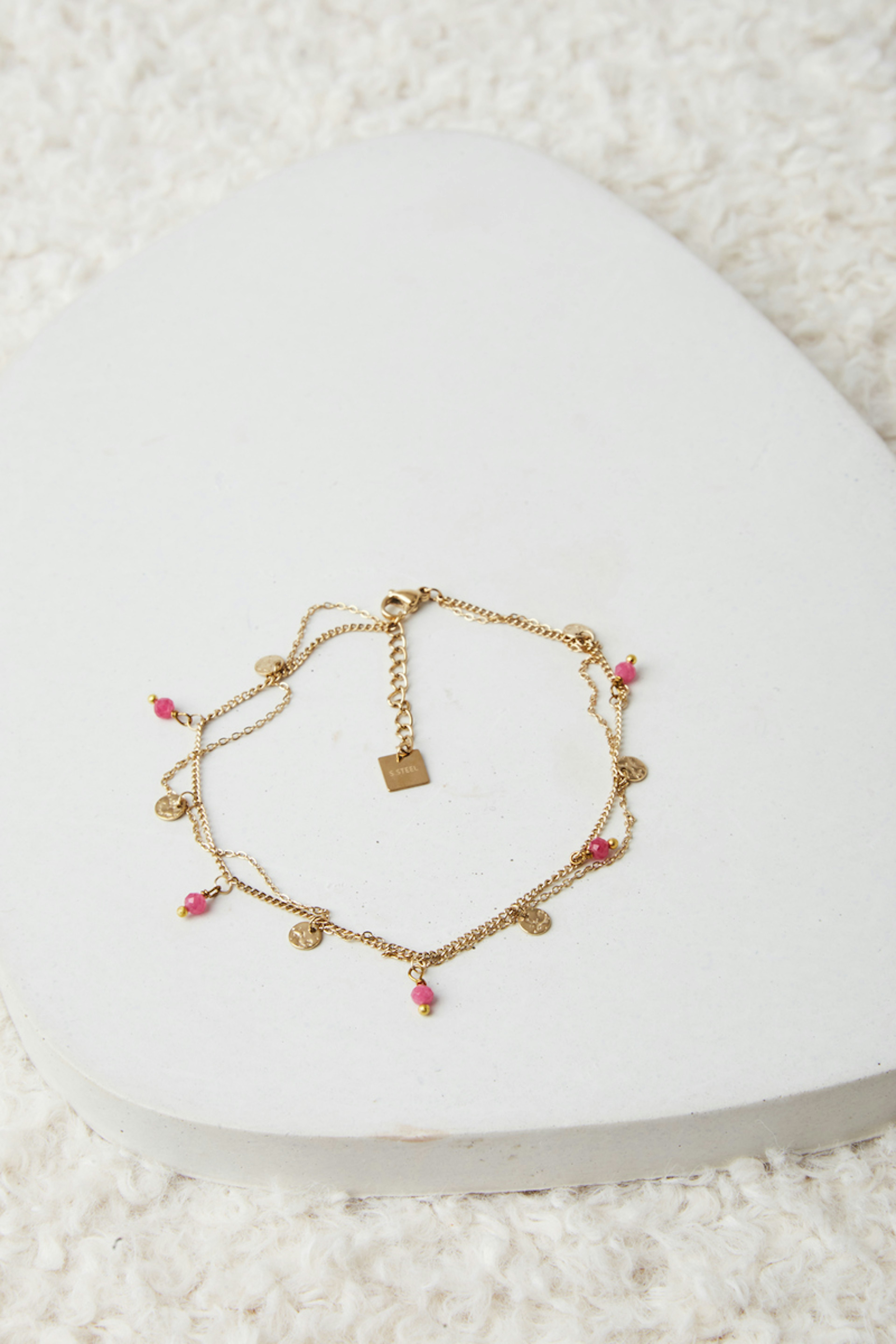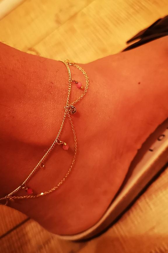 โข Chaine de cheville Gayle โข Bracelet multi rang dorรฉ โข Pierres roses et petites mรฉdailles martelรฉes dorรฉes โข Acier inoxydable โข Rรฉsiste ร l'eau et ne noircit pas
