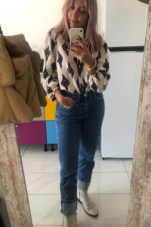 โข Chemisier blanc ร imprimรฉs bleus abstraits โข Manches longues avec emmanchures sur les ourlets รฉlastiques โข Col chemise avec patte de boutonnage โข Tissu fluide โข Made in France