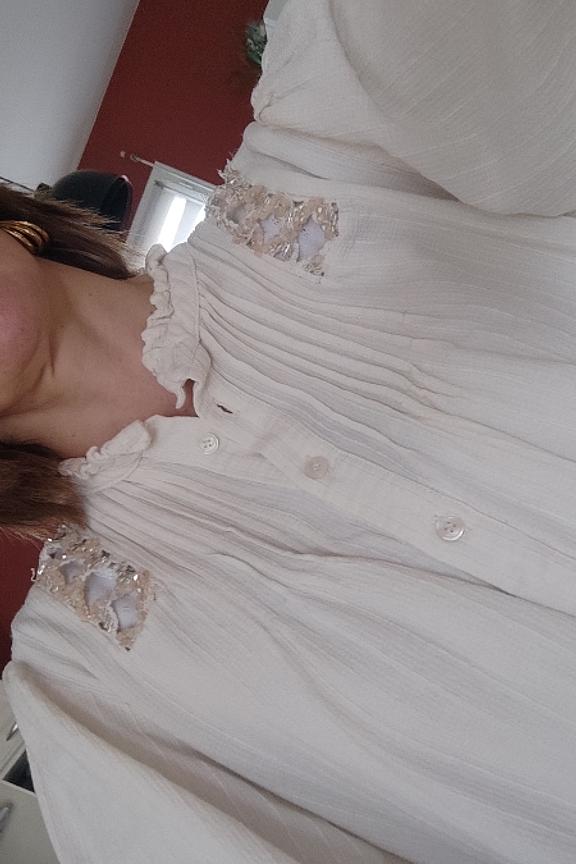 Pour un look chic et raffiné, associez cette blouse ornée de perles aux épaules avec un pantalon droit ou un jean. Ajoutez quelques bijoux délicats pour une touche d'élégance. Parfait en toute saison. • Blouse en coton et viscose • Col montant avec détails brodés • Manches longues bouffantes • Fermeture boutonnée à l'avant • Détails plissés sur le devant