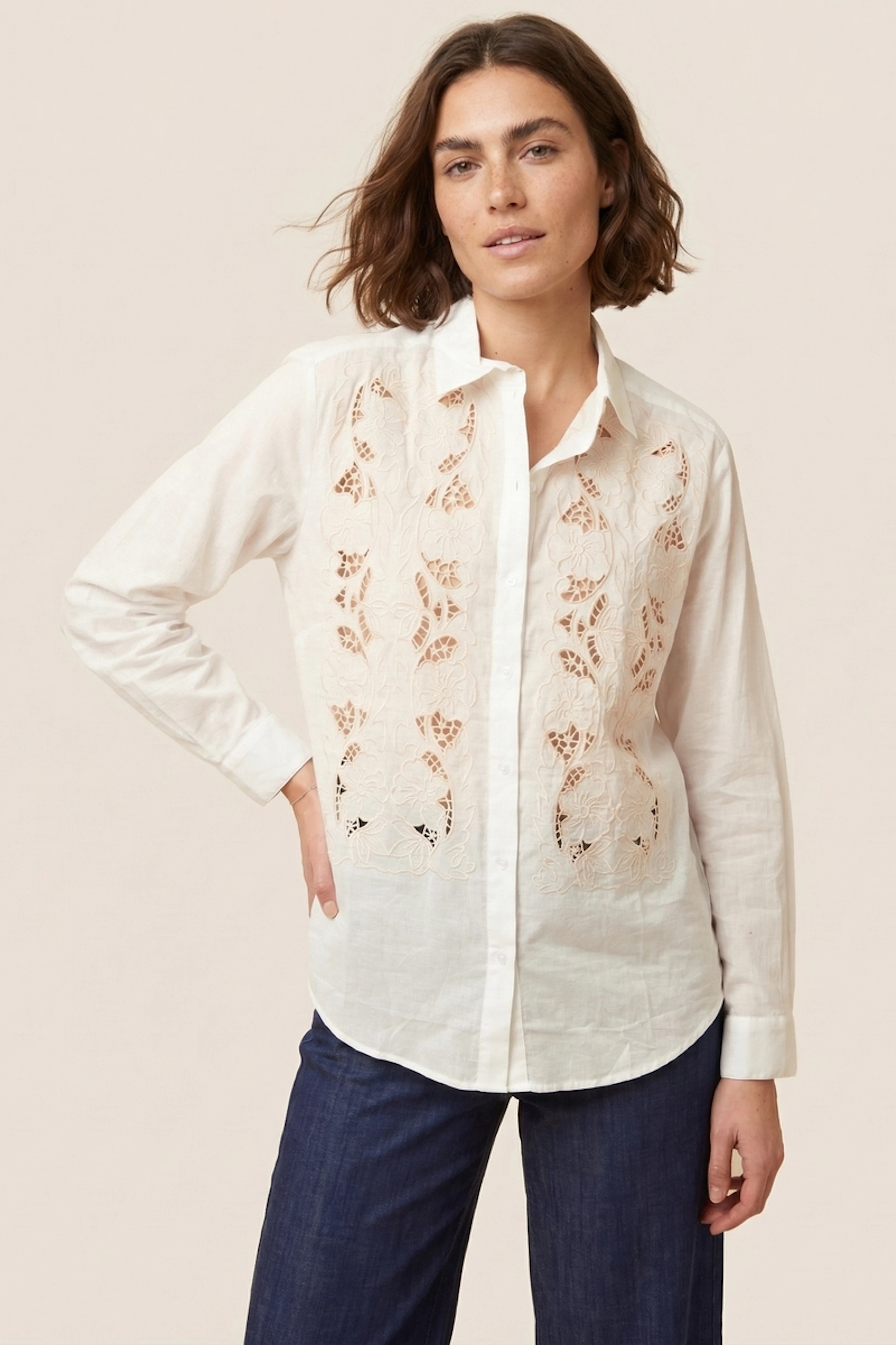 Associez cette chemise avec un jean droit et des bottines pour un look chic décontracté. Elle est parfaite en toute saison. • Chemise en coton • Col chemise classique • Manches longues • Détails brodés • Fermeture boutonnée devant