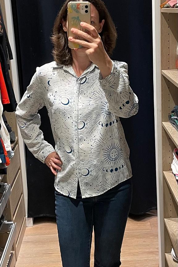 Associez cette chemise à motifs avec un jean slim et des bottines pour un look chic décontracté. Ajoutez une touche de couleur avec un sac à main vibrant. Parfait en toute saison. • Chemise à manches longues • Col chemise classique • Motif astres • Fermeture boutonnée devant • 100% viscose