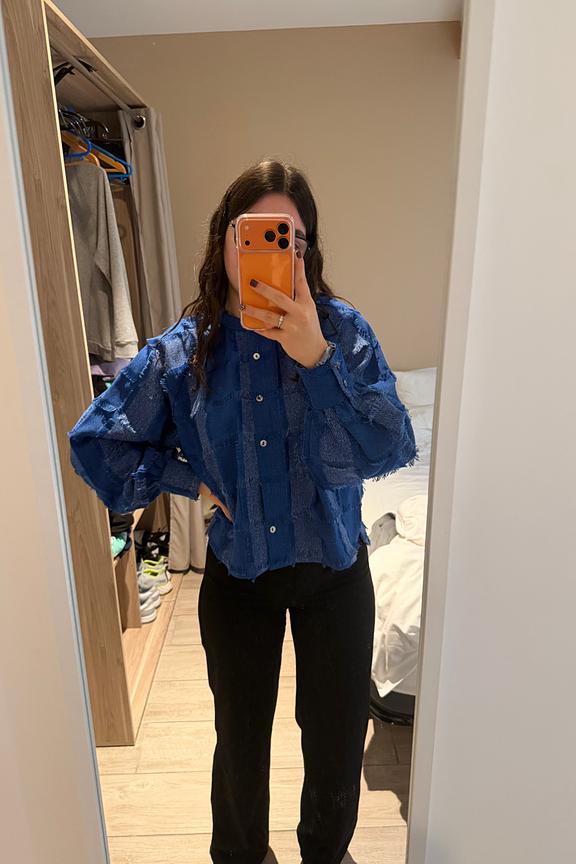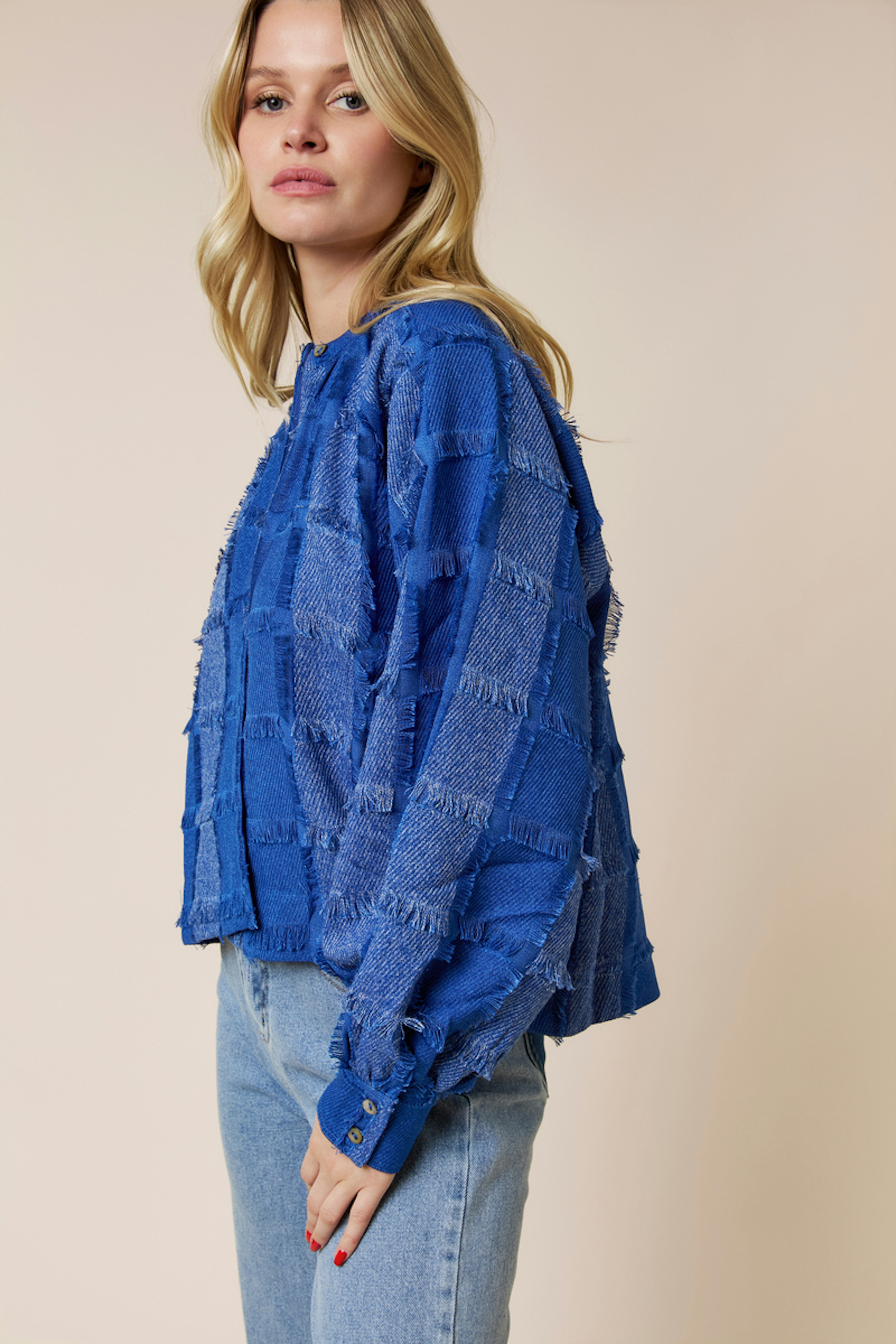 Portez cette chemise bleue moderne avec un pantalon noir chic et des bottines pour un look contemporain d'hiver. • Chemise à manches longues • Coupe oversize • Col Mao • Tissu à franges • Fermeture boutonnée à l'avant