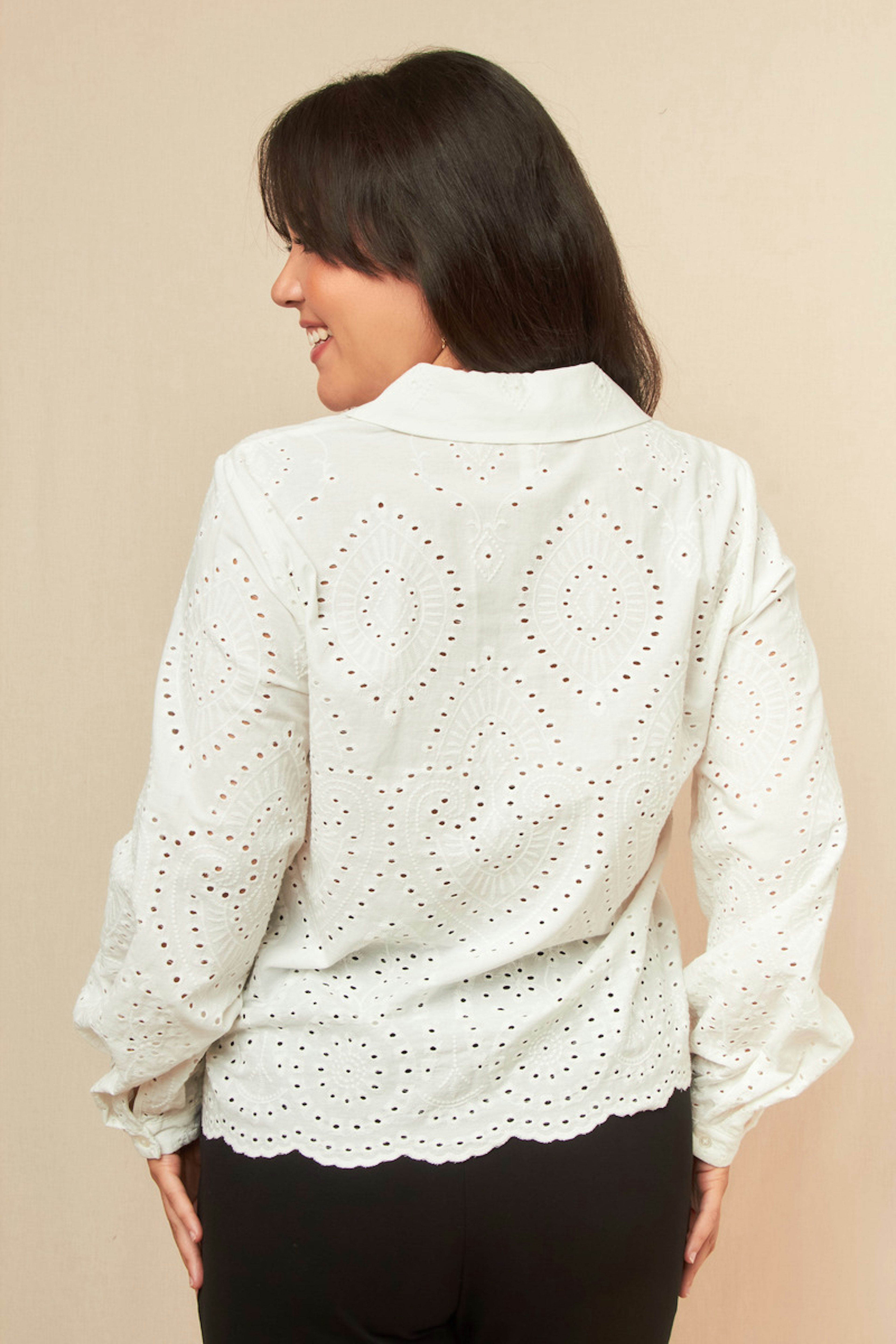 Portez cette chemise brodée avec un jean taille haute et des sandales pour un look chic et décontracté. Parfait avec des accessoires dorés. • Chemise en coton brodé • Manches longues élégantes • Col chemise structuré • Couleur blanche lumineuse • Boutons discrets à l'avant