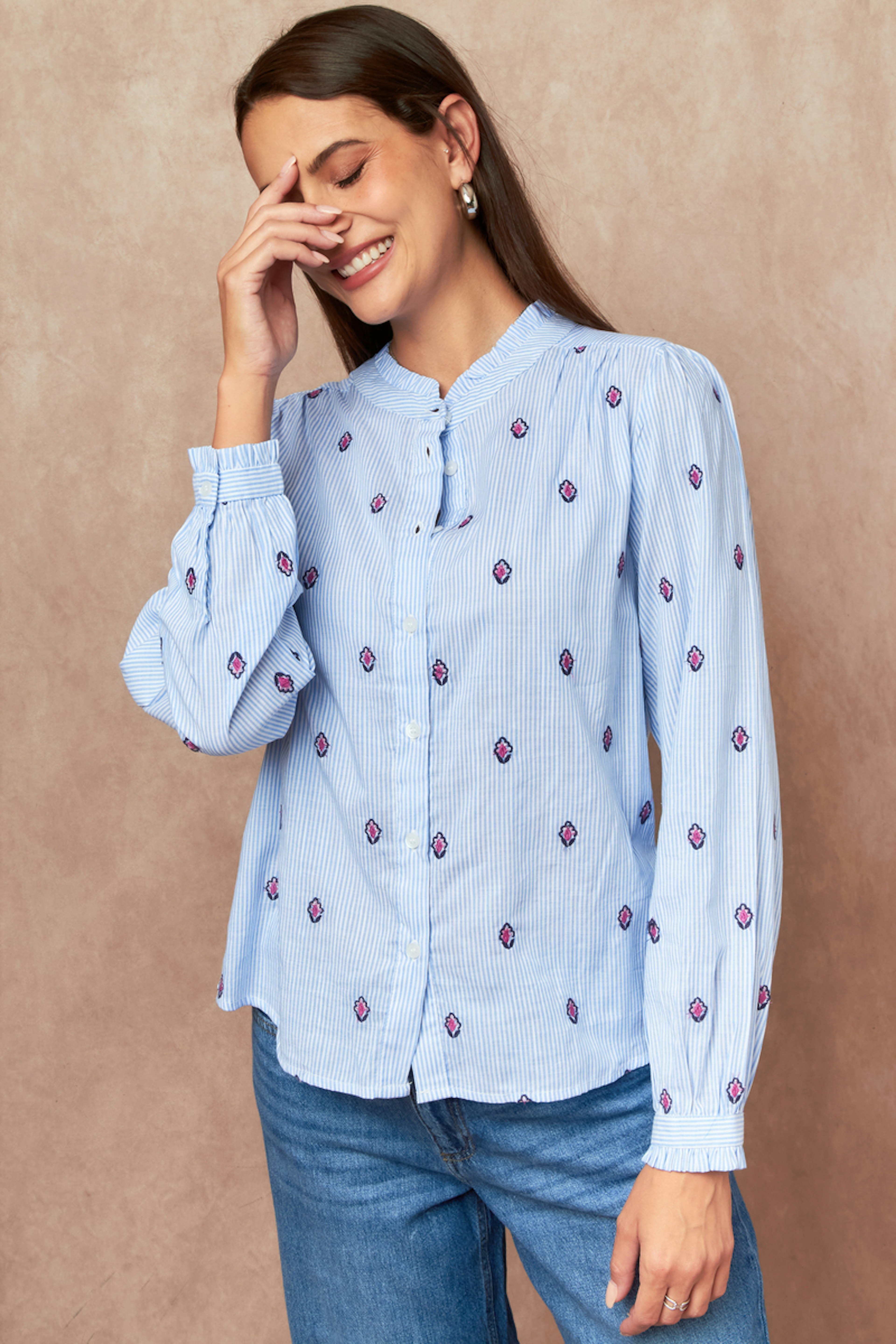Associez cette chemise à un pantalon slim et des bottes pour un look chic et hivernal. • Chemise 100% coton • Col Mao élégant • Manches longues • Coupe légèrement ample • Motif imprimé subtil