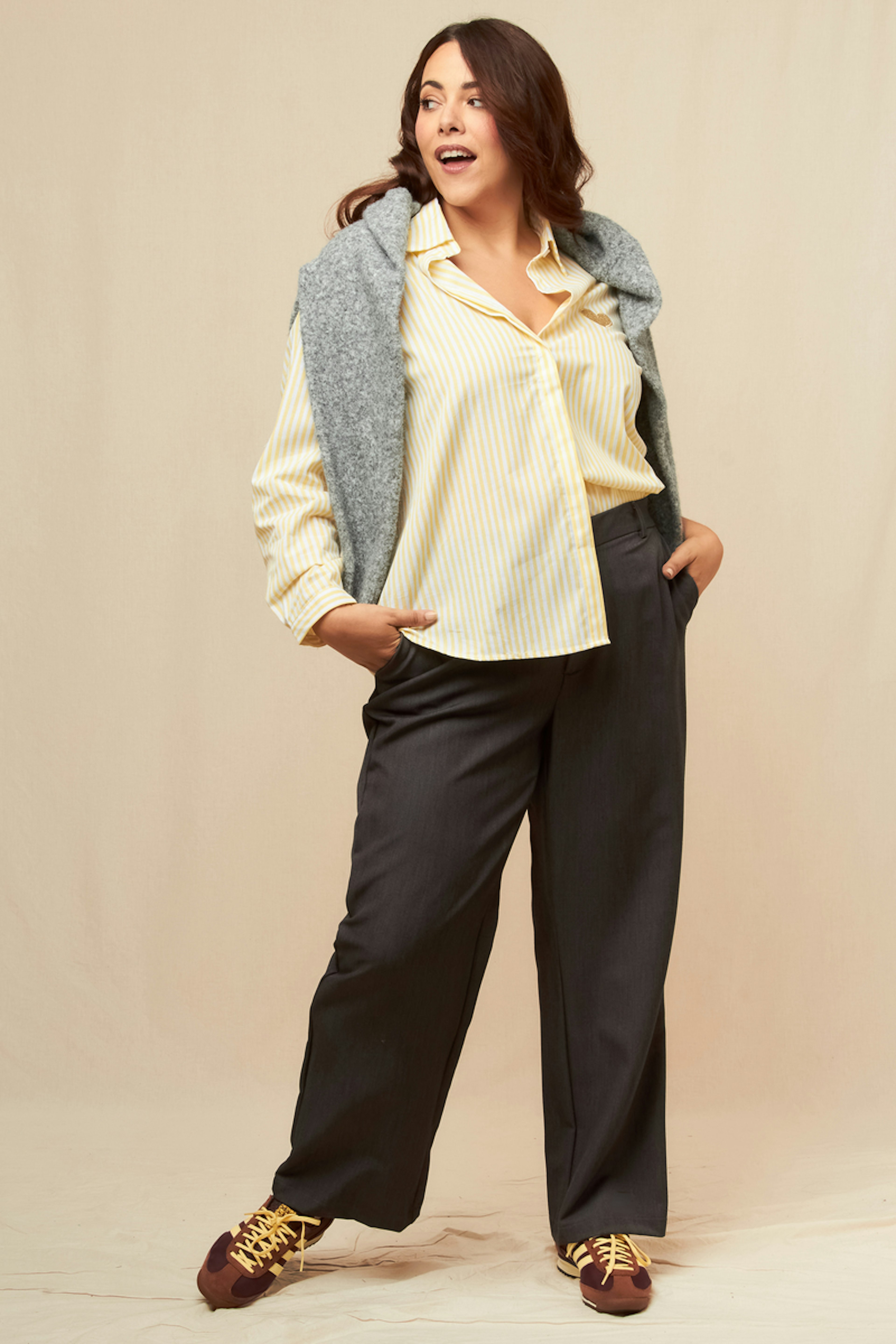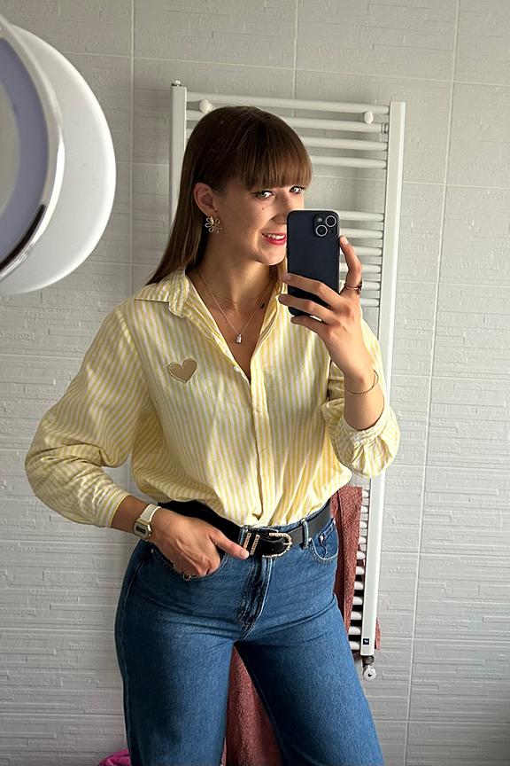Portez cette chemise rayée avec un jean blanc et des espadrilles pour un look estival chic. Parfait en toute saison pour un style pétillant et frais. • Chemise en coton • Manches longues retroussables • Col classique • Imprimé rayé • Détail cœur brodé