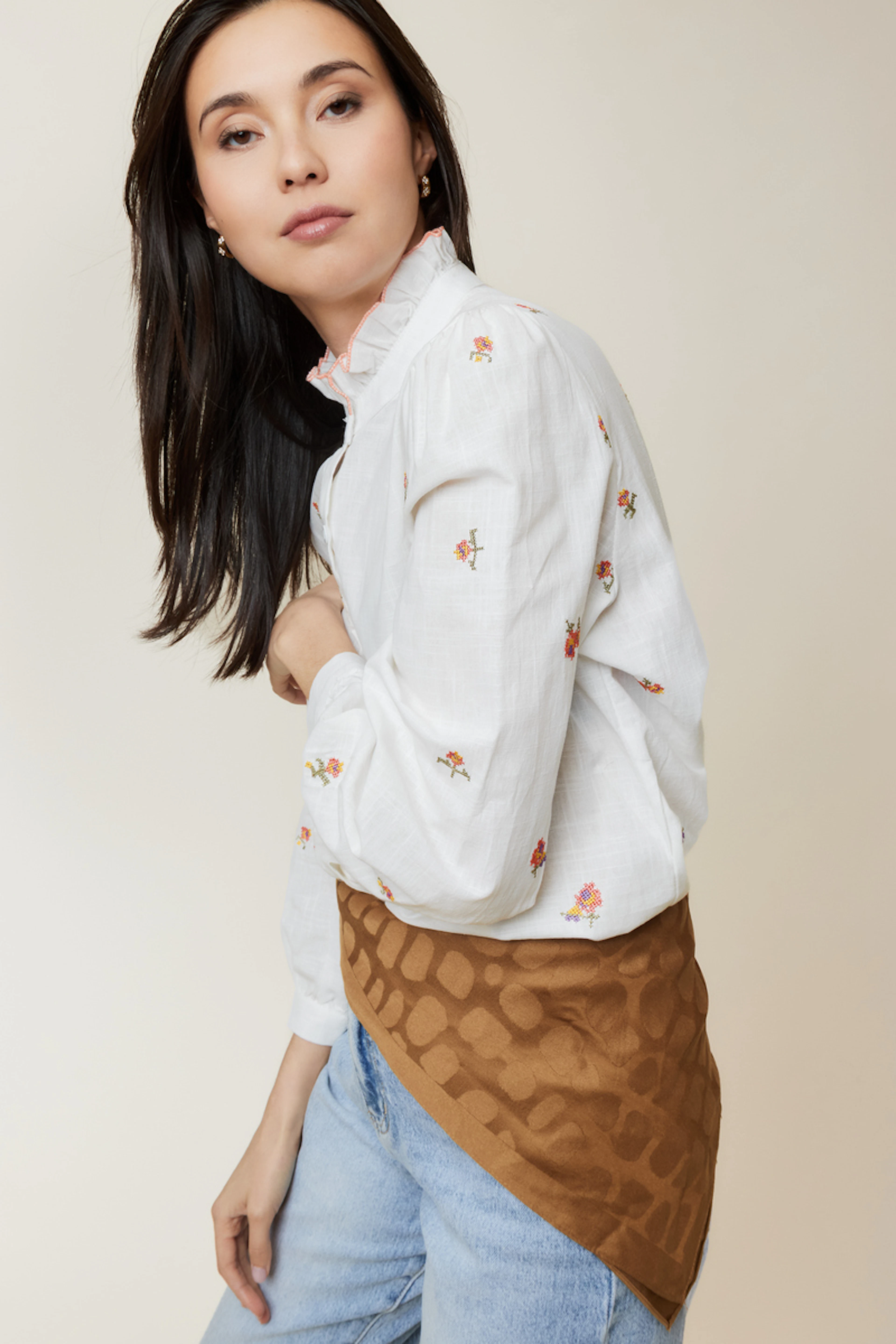 Idéale avec un jean taille haute et des sandales pour un look estival chic et décontracté. • Chemise en coton • Coupe tempérée • Manches longues • Motif imprimé • Col montant froufrou