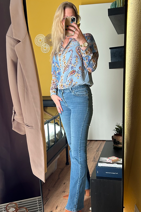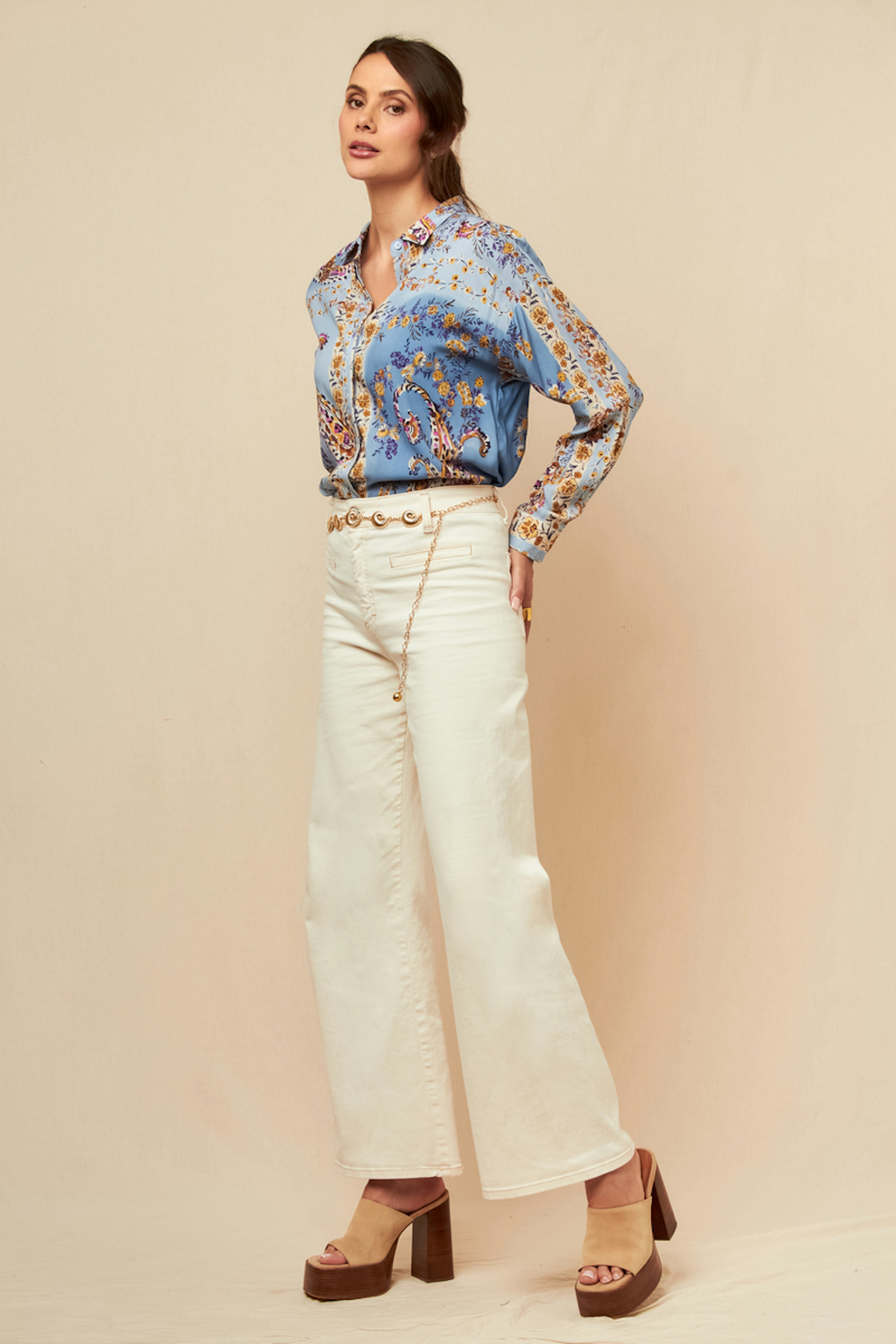 Associez cette chemise à un pantalon blanc taille haute pour un look chic et décontracté, parfait pour égayer les journées d'hiver. • Chemise à manches longues • Coupe décontractée • Col chemise classique • Imprimé floral paisley • Tissu en rayon doux et fluide