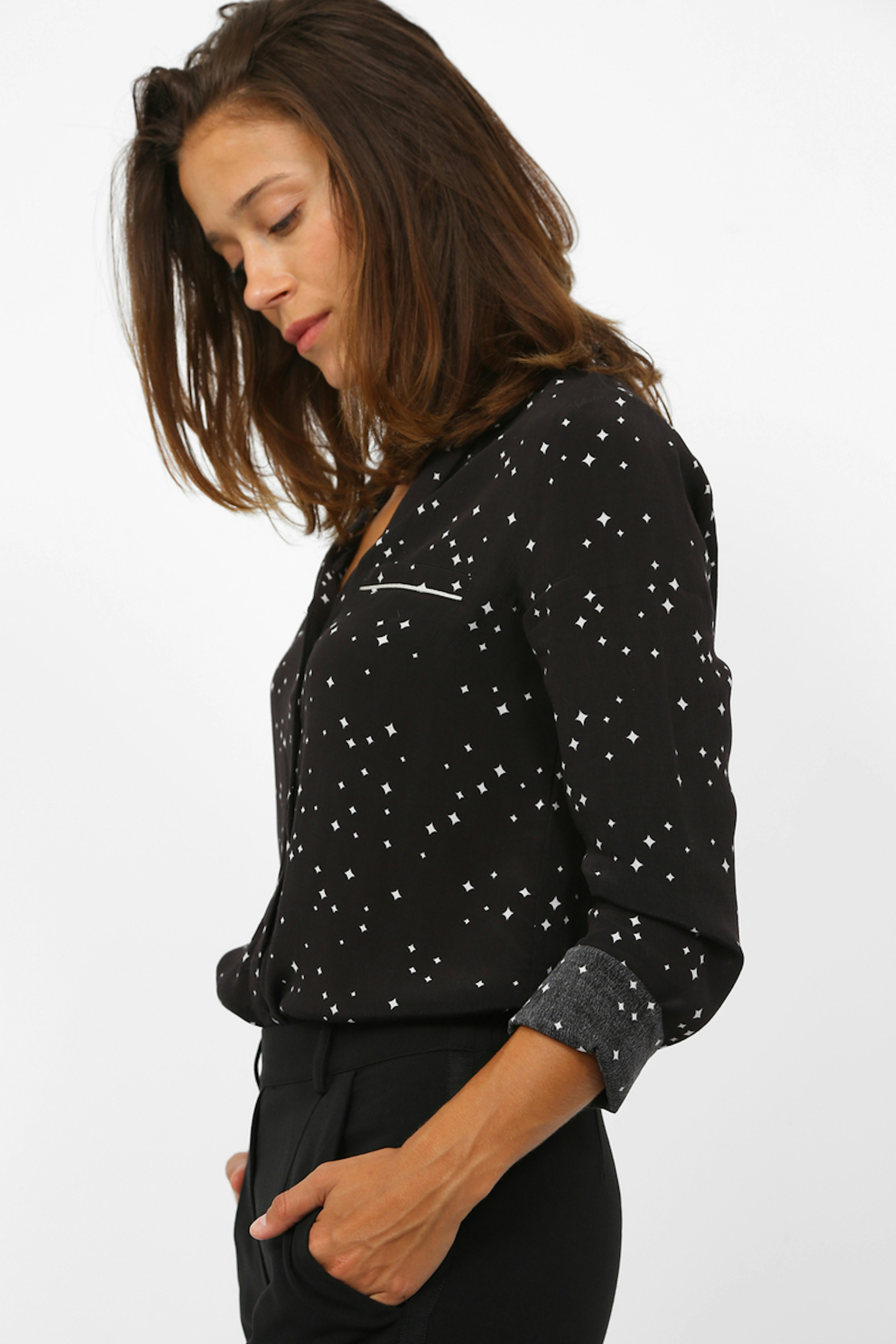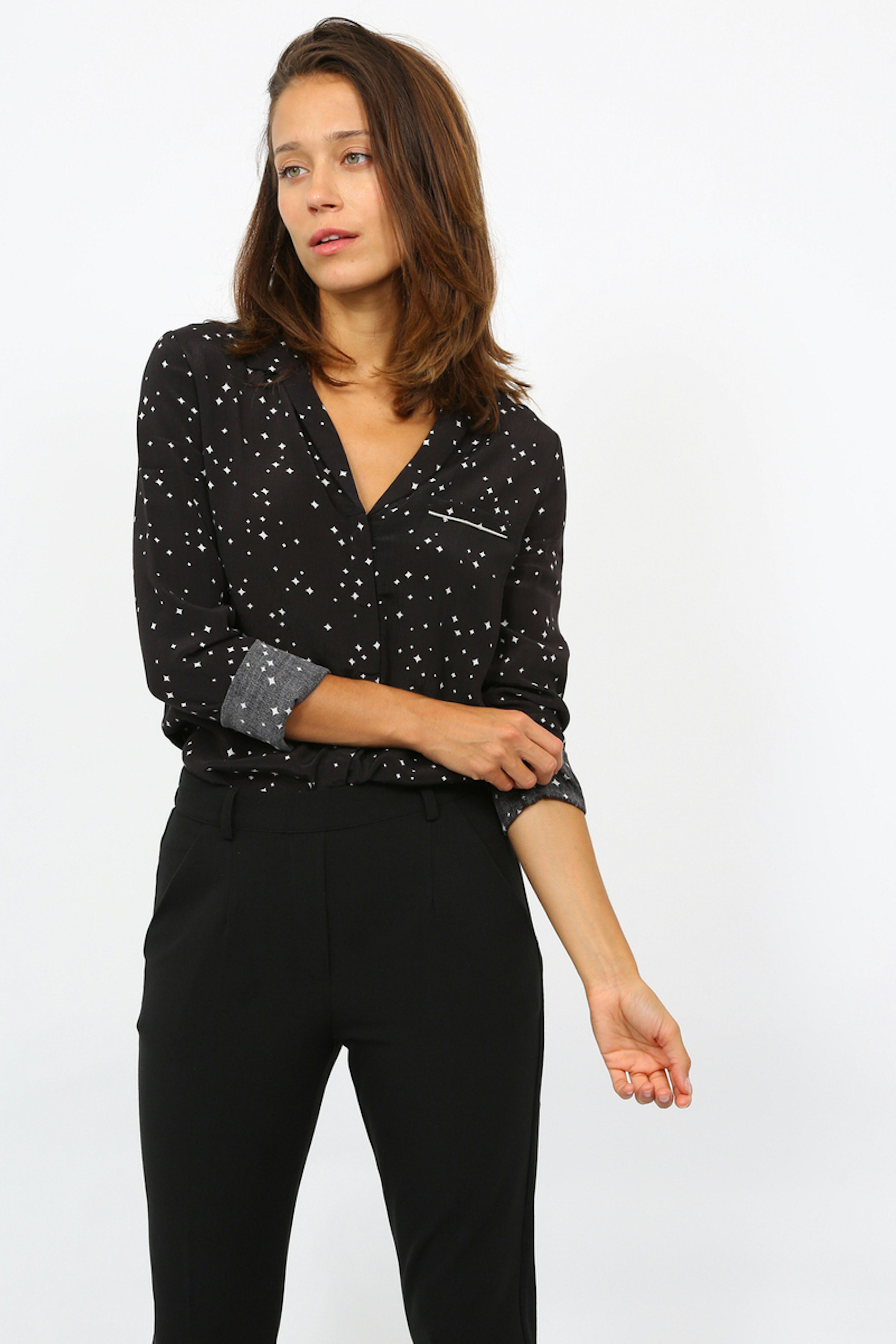 Chemisier noir, manches longues avec col et imprimรฉ รฉtoiles.