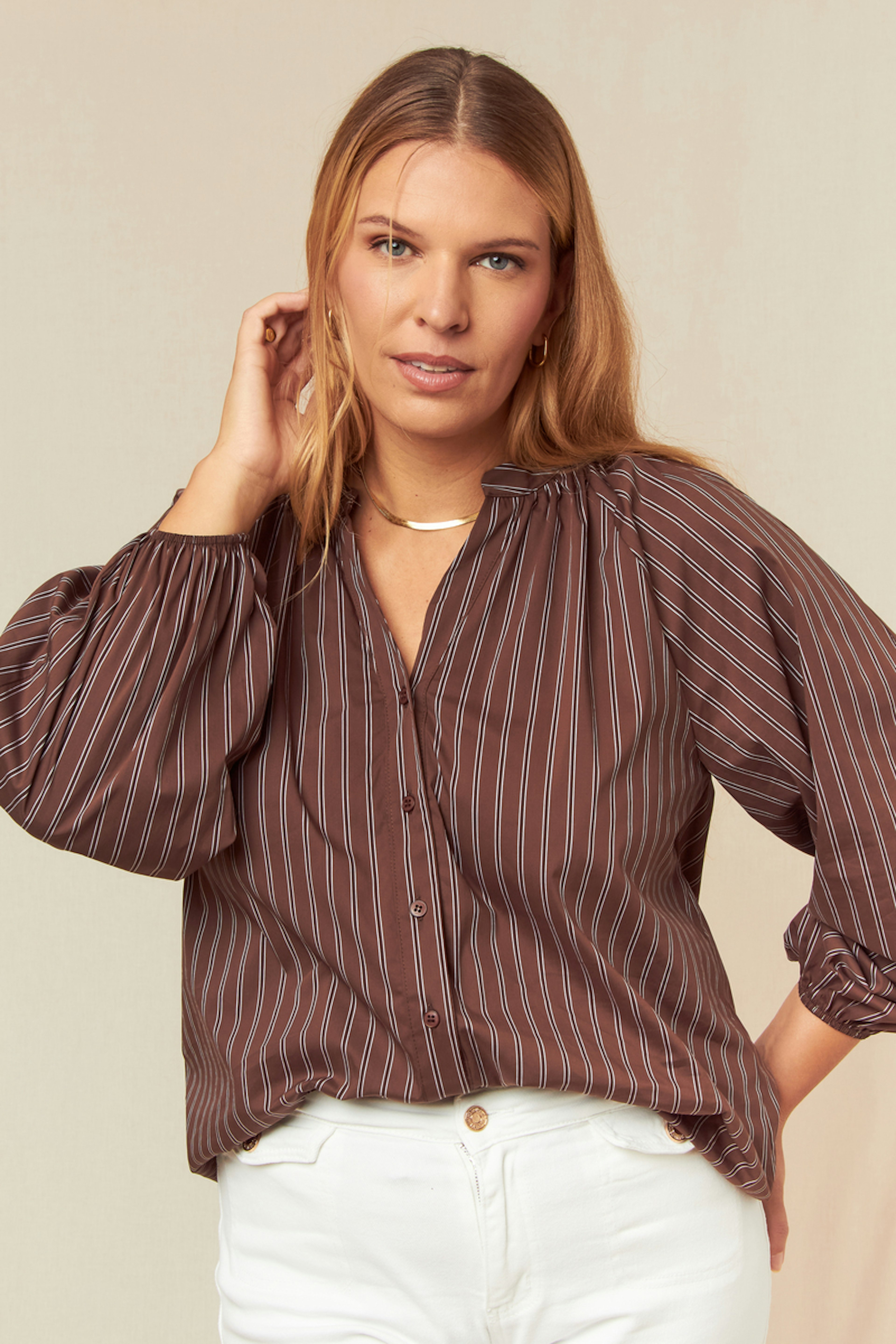 Ajoutez une touche chic avec des bottines et un pantalon taille haute pour une allure sophistiquée cet hiver. • Chemise à rayures • Coupe ample • Manche longue • Col en V • Douce fluidité du tissu