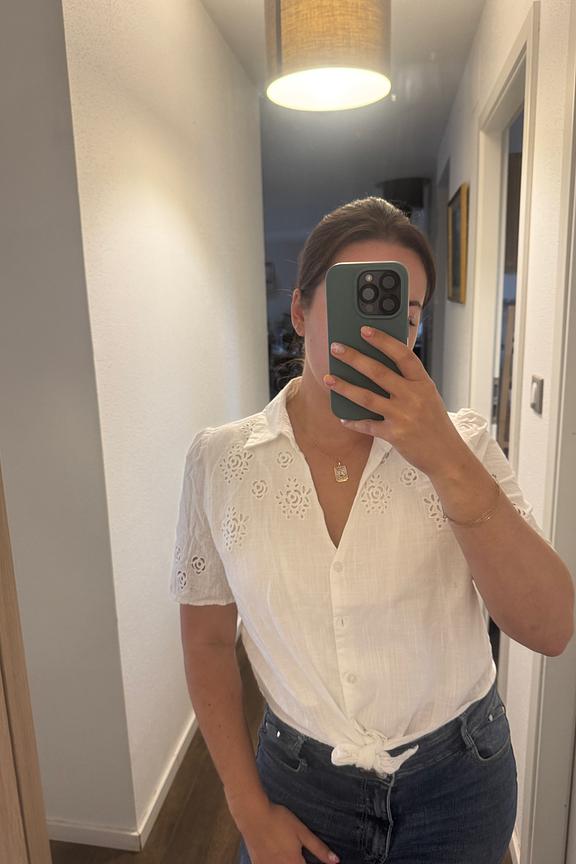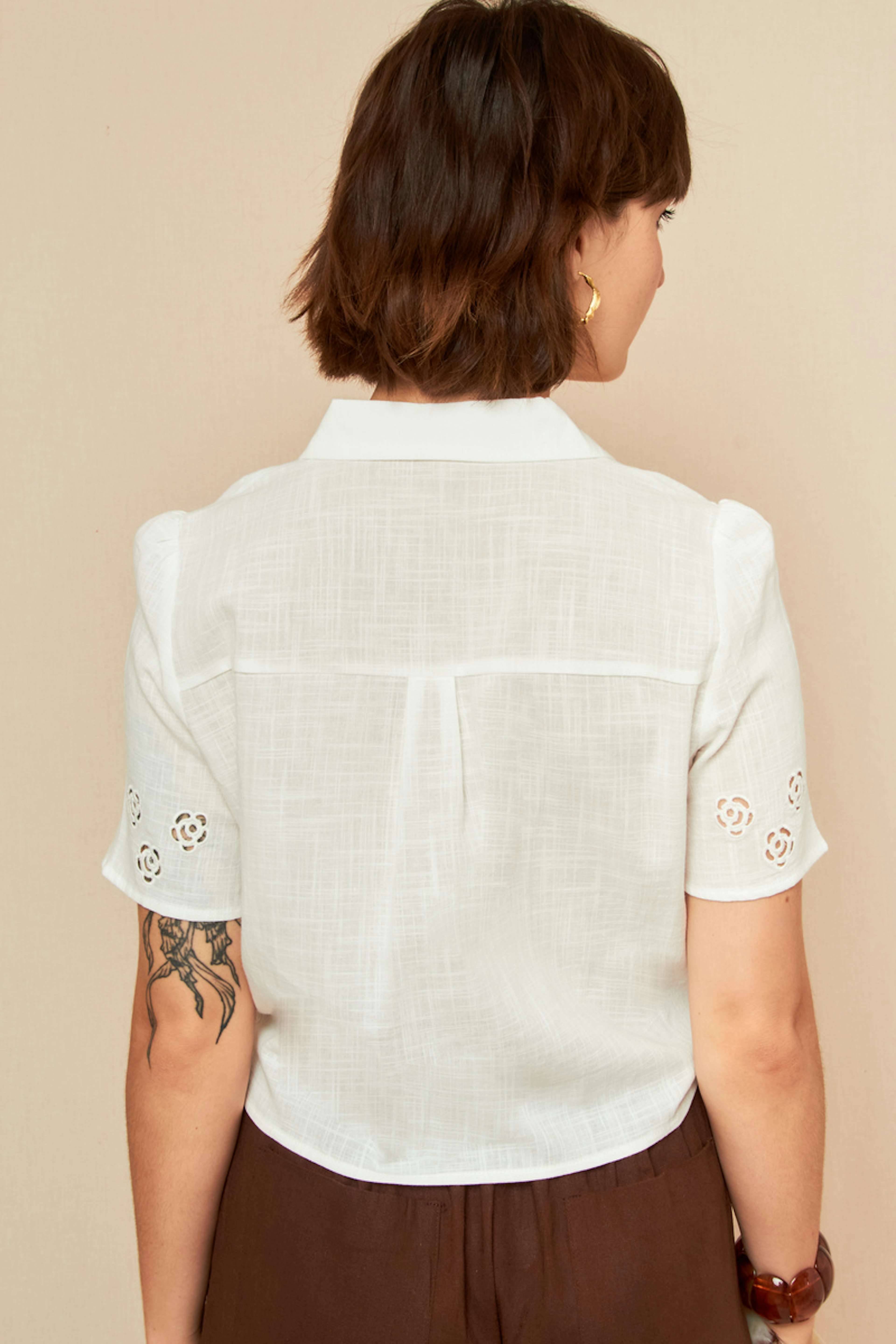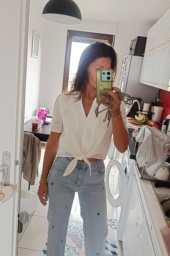 Associez cette blouse à un jean taille haute et des sandales pour une allure estivale tout en fraîcheur. • Blouse en coton • Manches courtes • Nœud sur le devant • Col chemise • Broderies florales