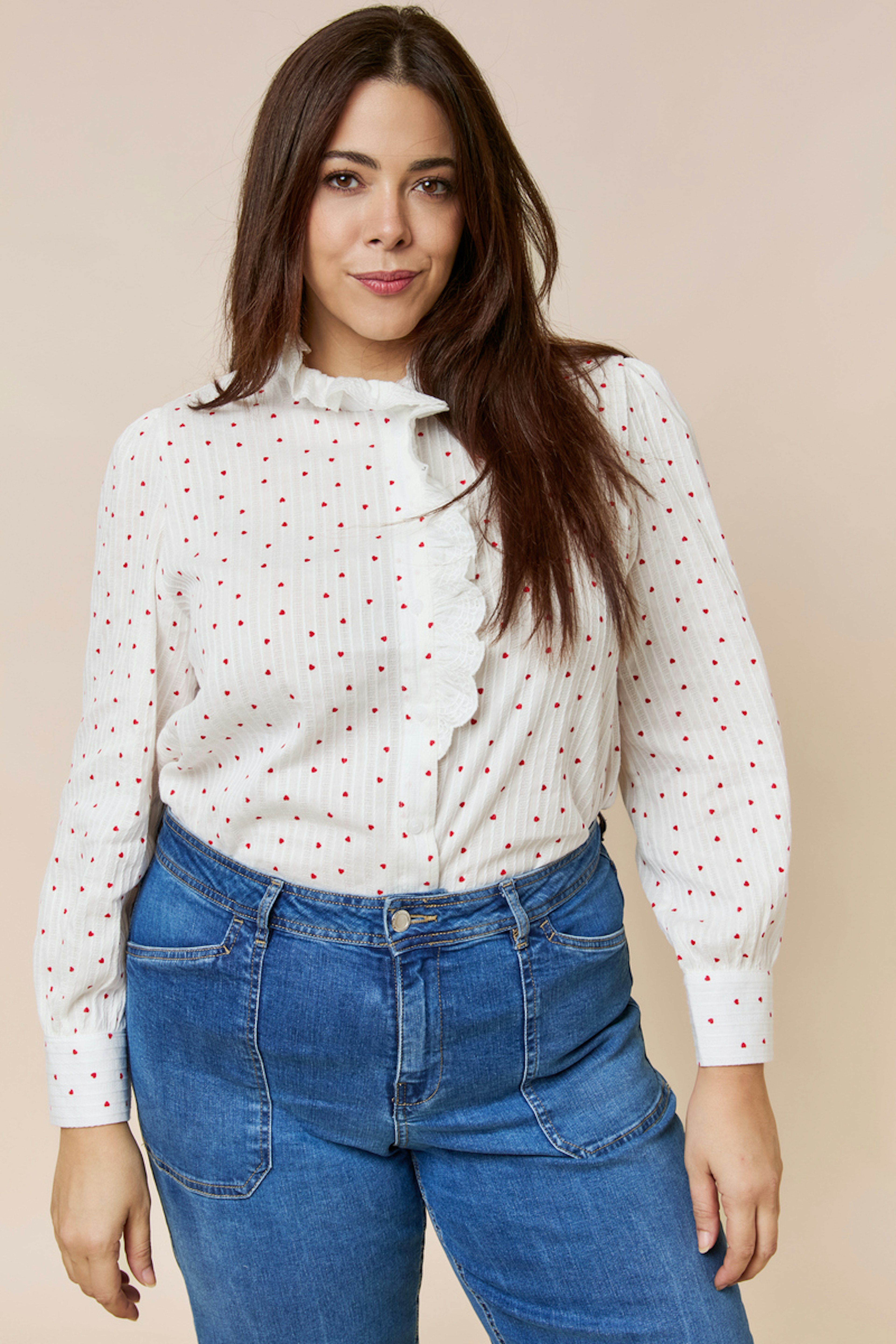 Associez cette chemise à un jean taille haute et des bottines pour un look confortable et chaleureux en hiver. • Chemise en coton blanche • Manches longues élégantes • Col à volants romantique • Imprimé délicat de petits motifs • Fermeture boutonnée discrète