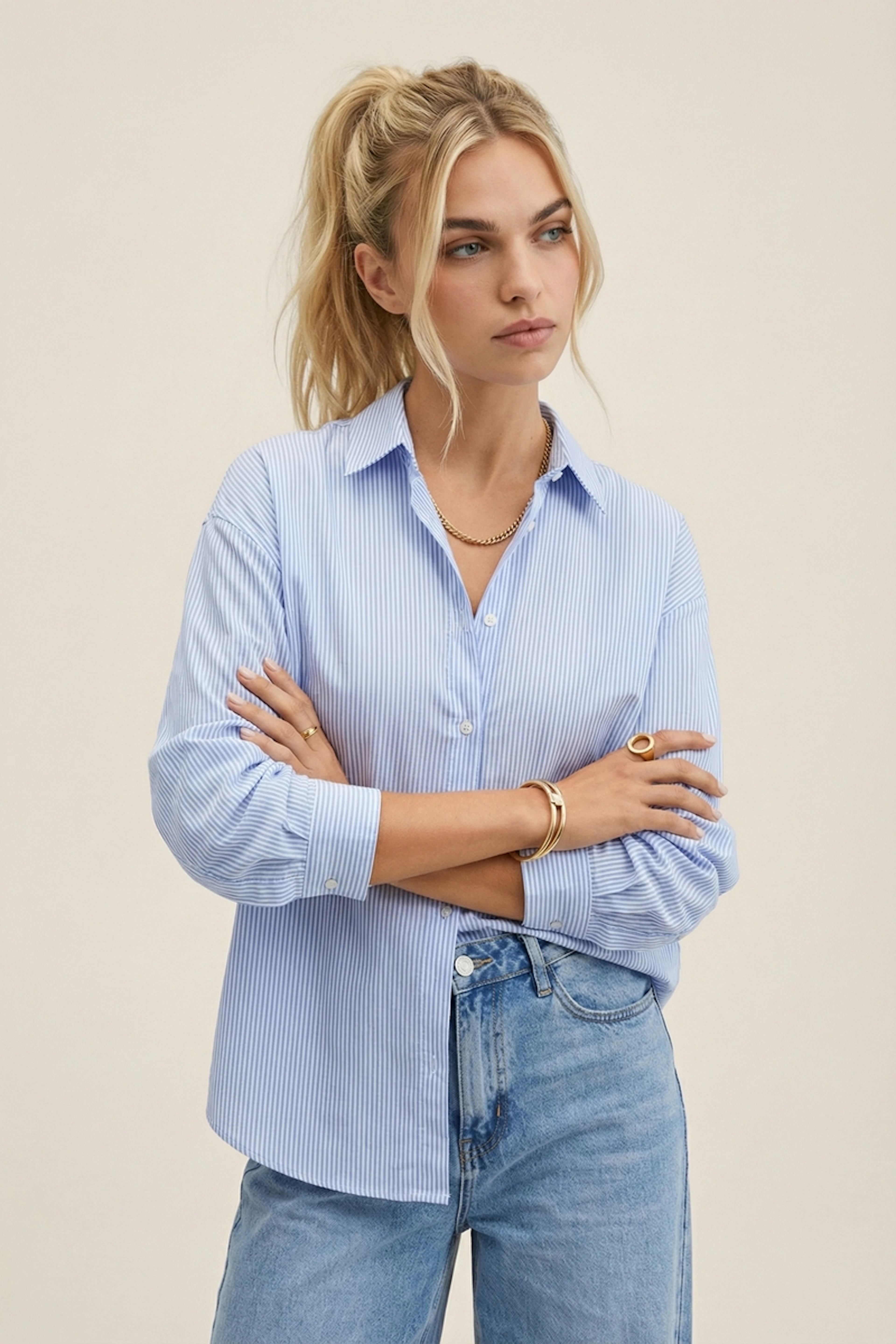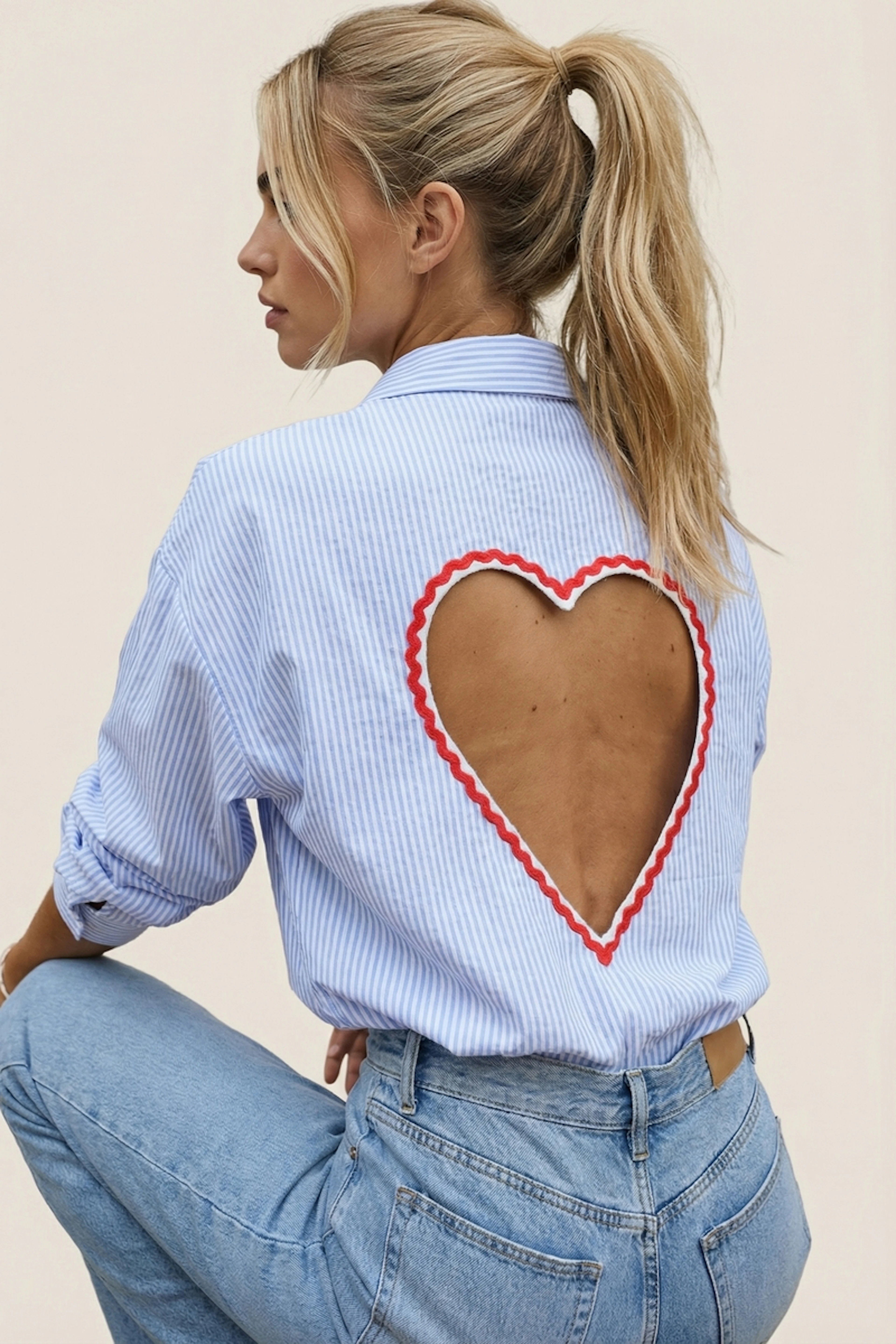 Associez cette chemise à un short en lin et des sandales minimalistes pour un look estival chic et décontracté. • Chemise en coton fin • Coupe droite classique • Ouverture dos en forme de cœur • Rayures discrètes • Détails bordures rouges vibrantes