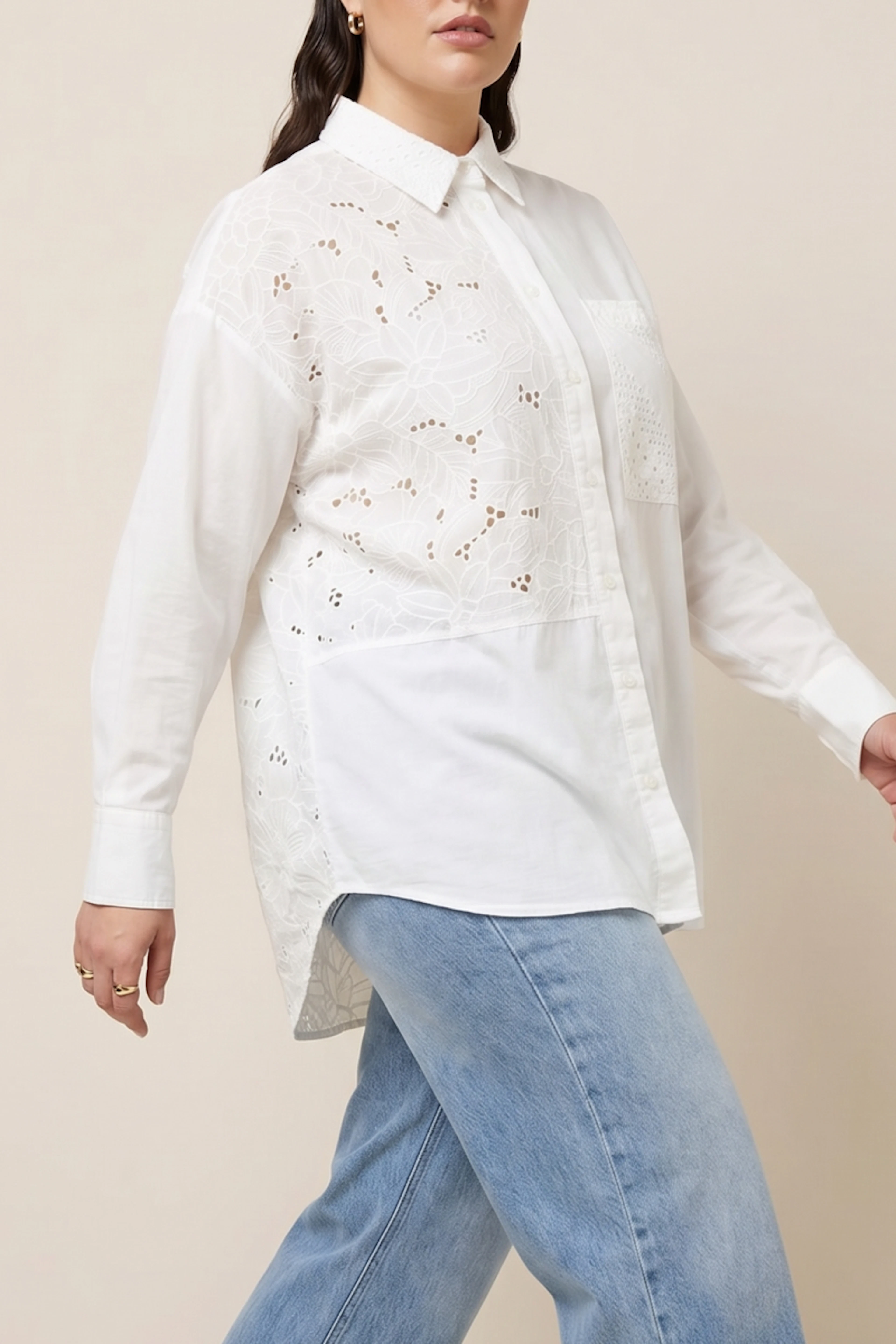 Associez cette chemise à broderies délicates avec un pantalon en velours côtelé pour un look chic hivernal. Ajoutez des bottines pour une touche élégante. • Chemise à manches longues • Broderie florale • Col chemise classique • Coupe ample • Poche avant intégrée