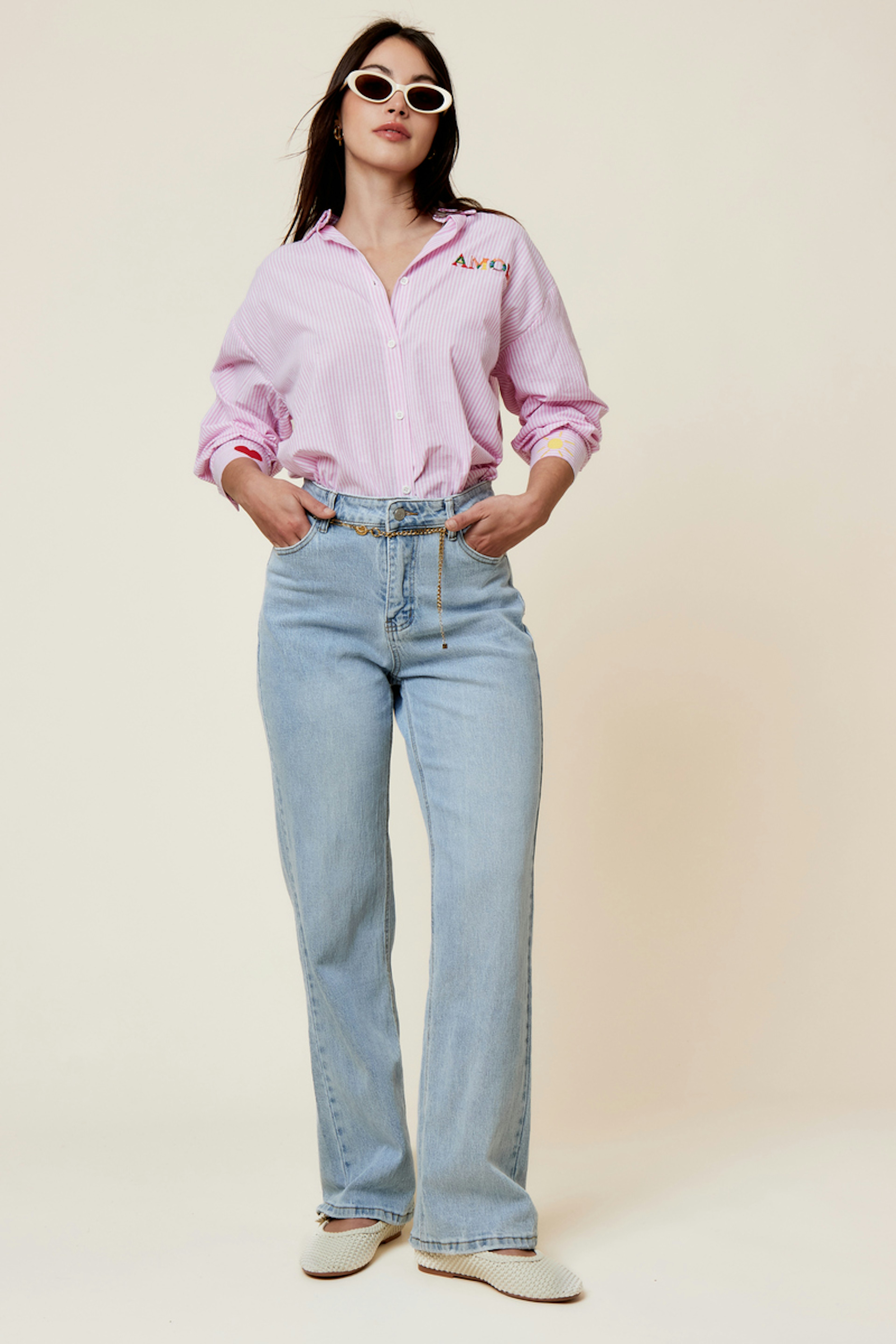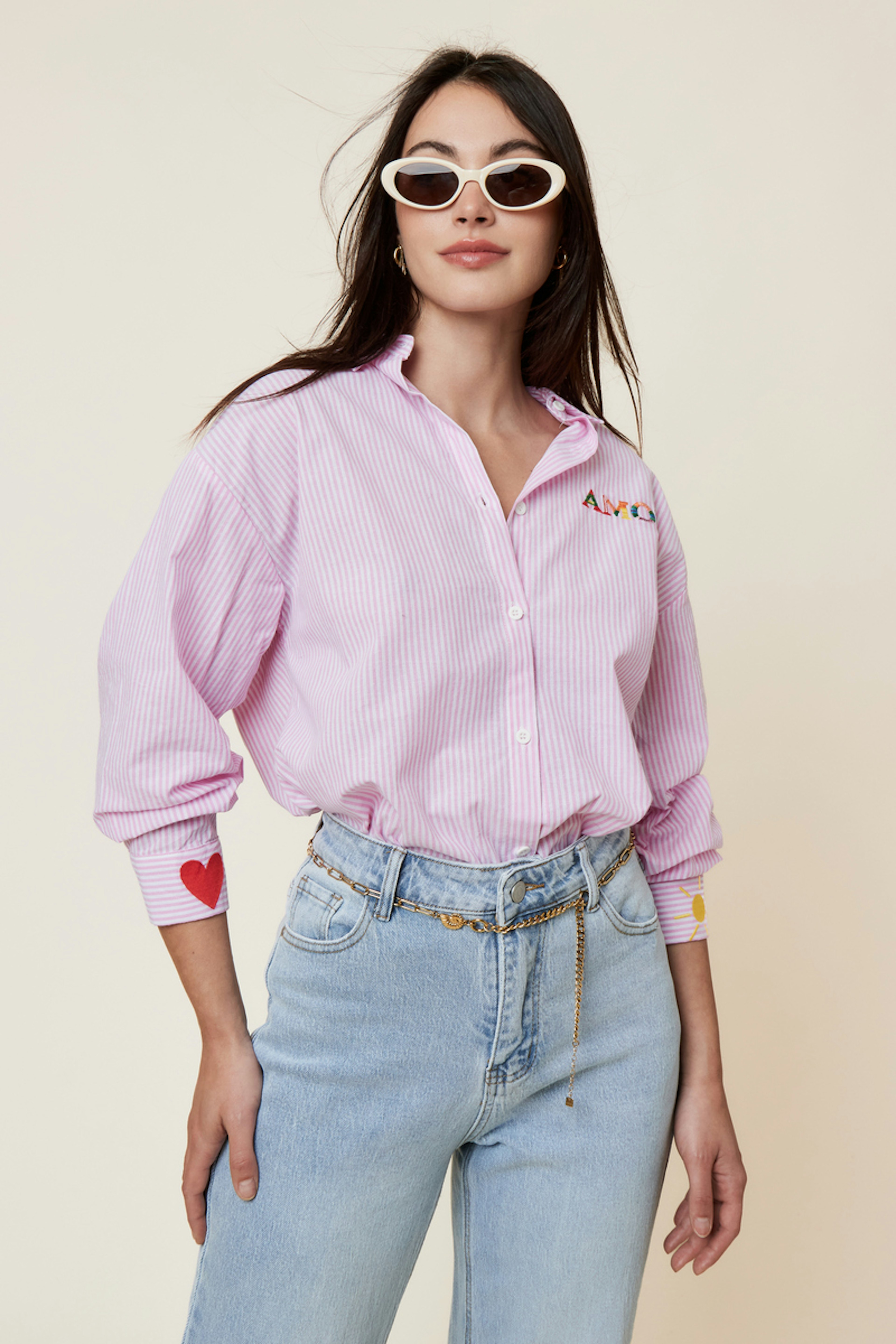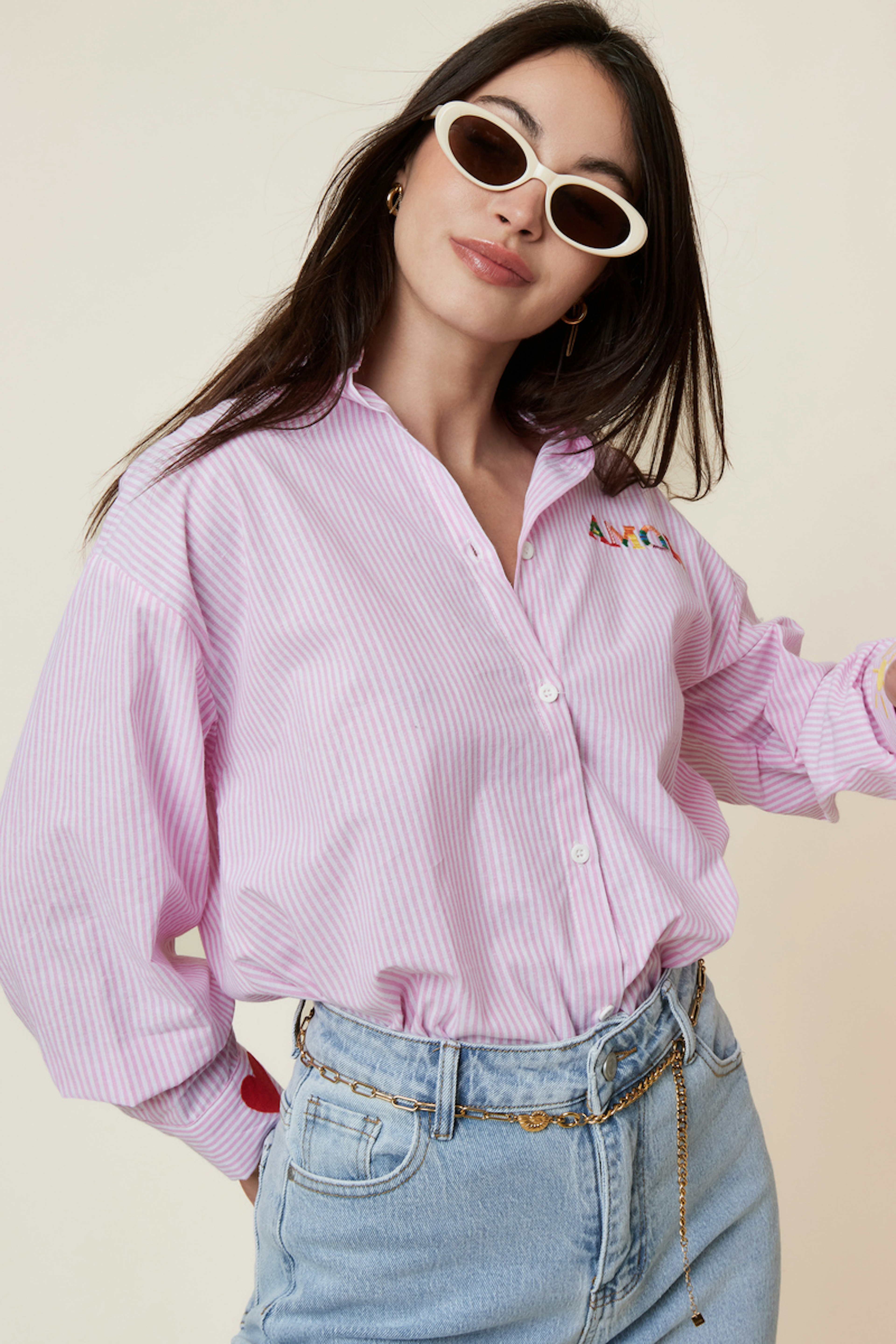 Ajoutez une touche de fraîcheur à votre look avec des lunettes de soleil et un jean taille haute. • Chemise en coton • Coupe ample • Manches longues • Col chemise • Motif rayures et broderie colorée
