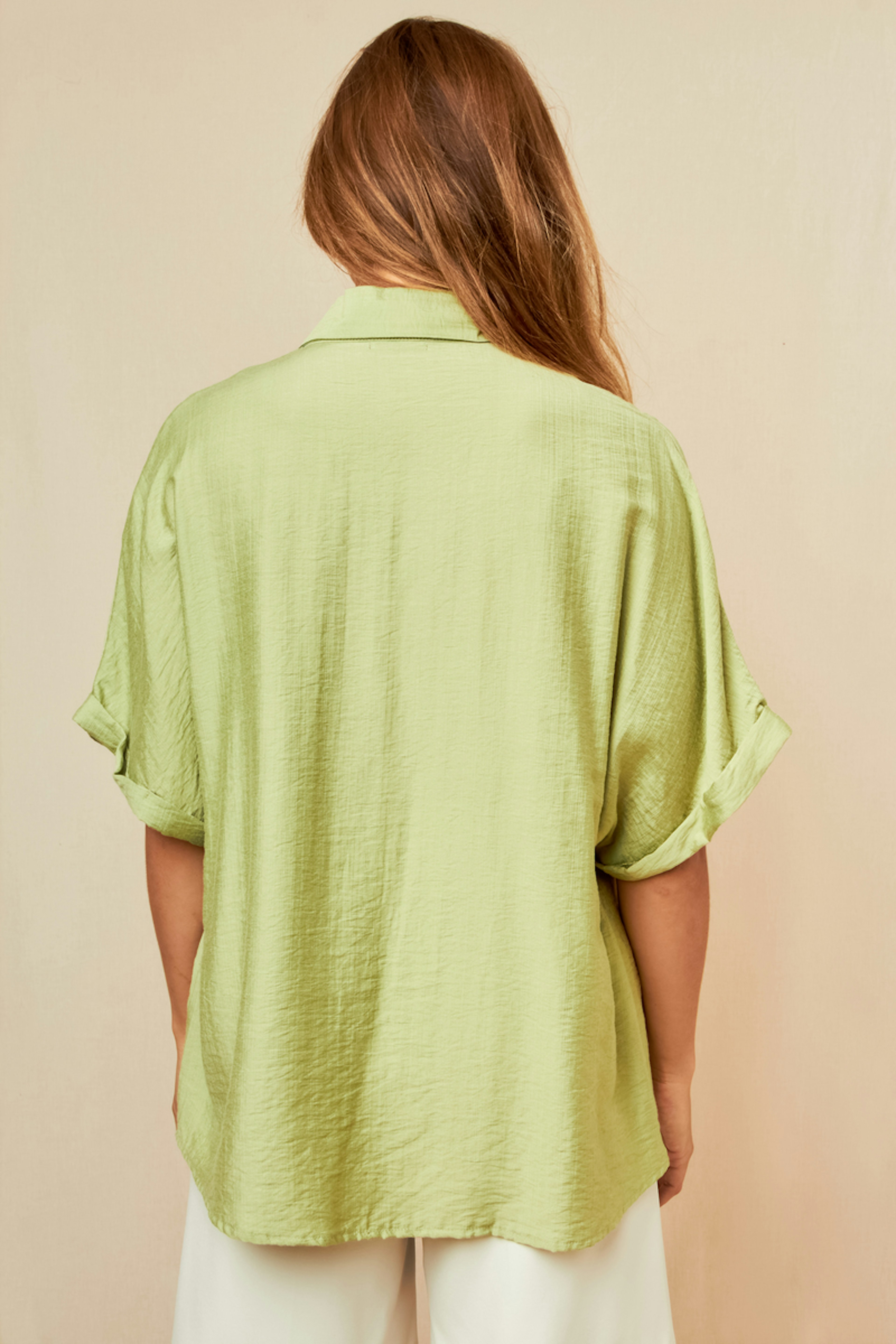 Pour un look décontracté, associez cette chemise verte avec un pantalon blanc et des sandales en cuir pour un style estival frais. • Chemise à manches courtes • Coupe ample et confortable • Col chemise classique • Boutonnage frontal discret • Texture subtile et légère
