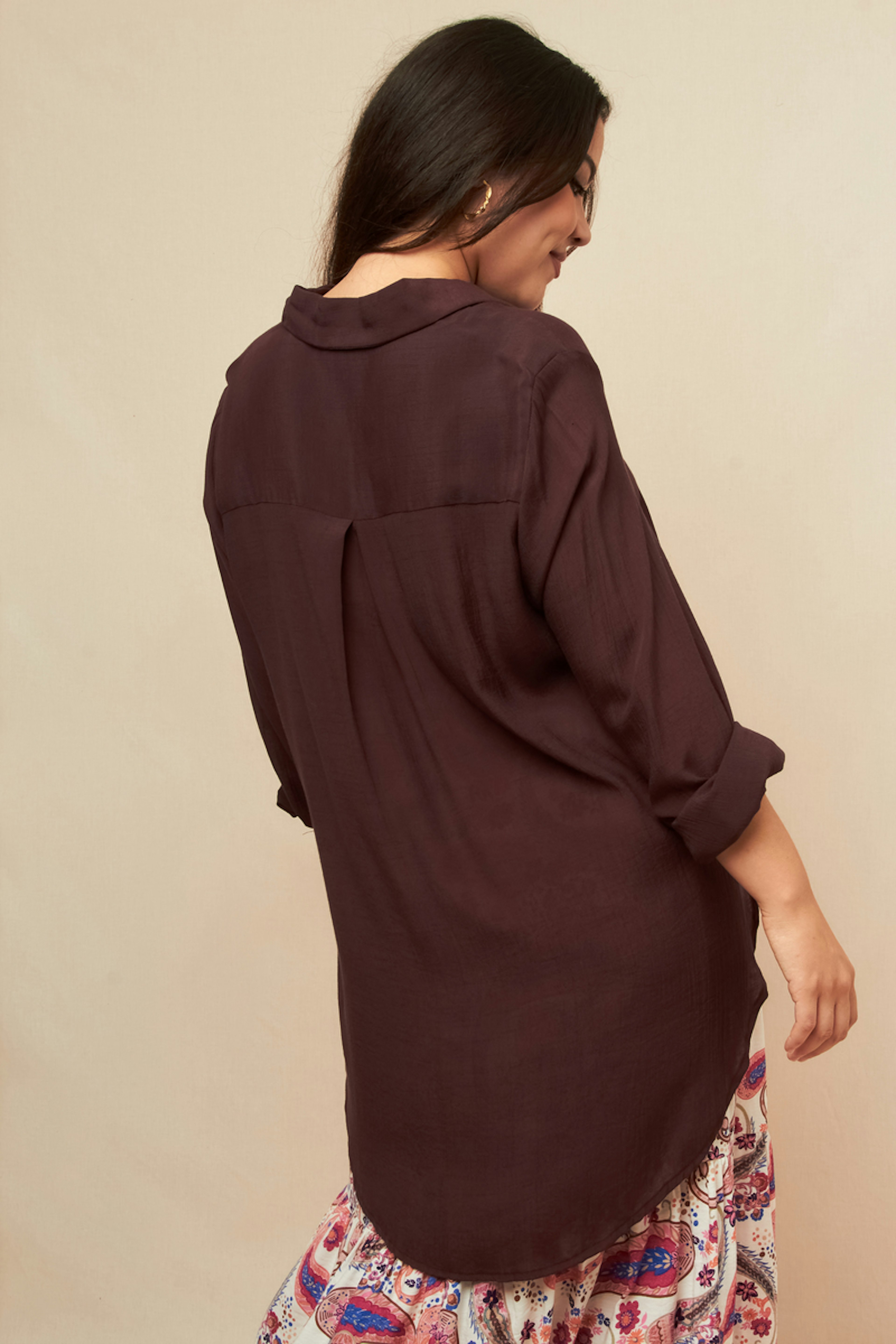 Pour un look chic et décontracté, associez cette chemise à un pantalon clair et des accessoires dorés. Parfaite en toute saison. • Chemise à manches longues • Col chemise • Boutons sur le devant • Coupe fluide • Couleur violet profond