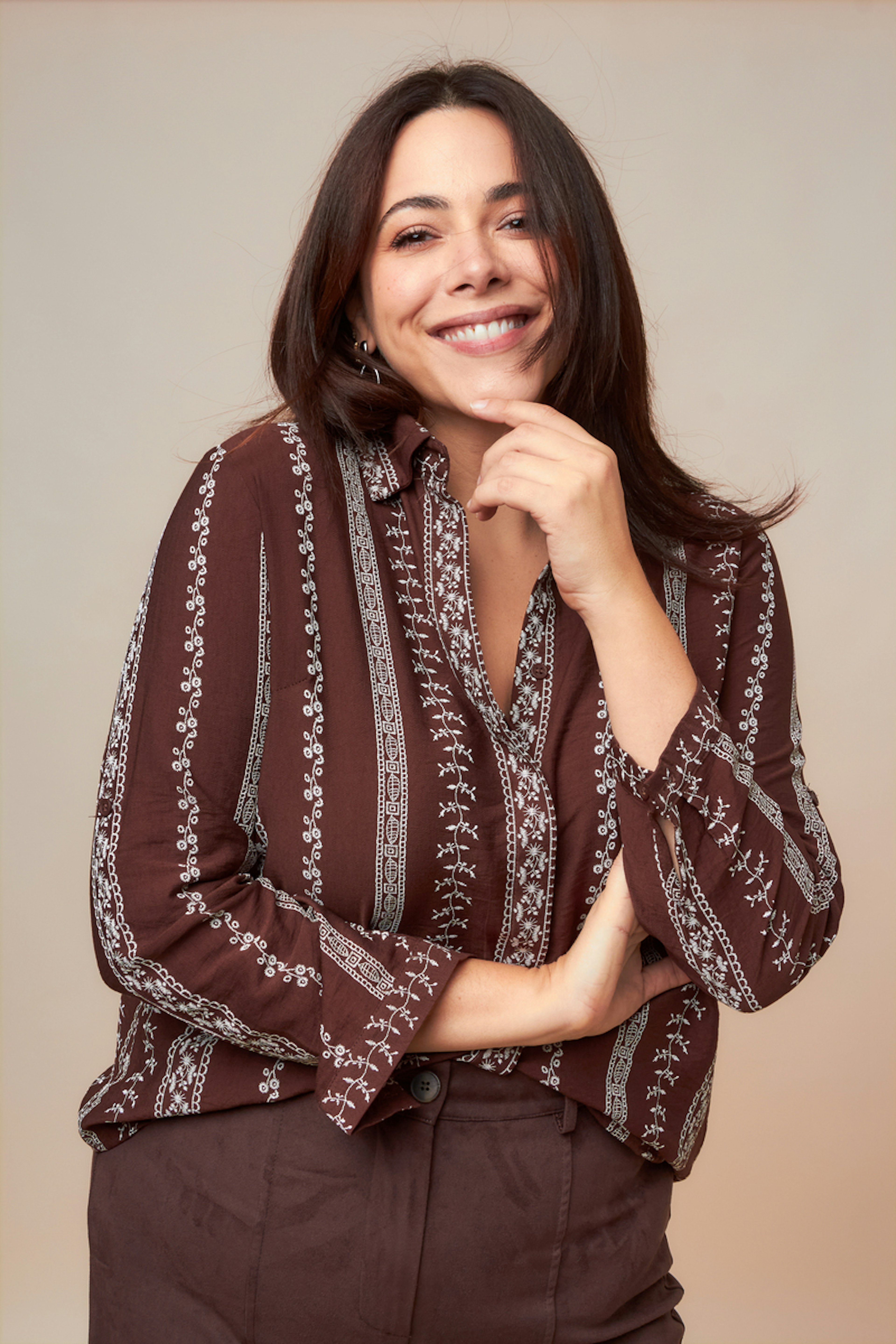 Pour une allure raffinée, associez cette chemise à un pantalon large crème et des mocassins en cuir. Idéale pour l’hiver. • Chemise à manches longues • Coupe classique et fluide • Col chemise ouvert • Motif imprimé • Teinte marron chaleureuse