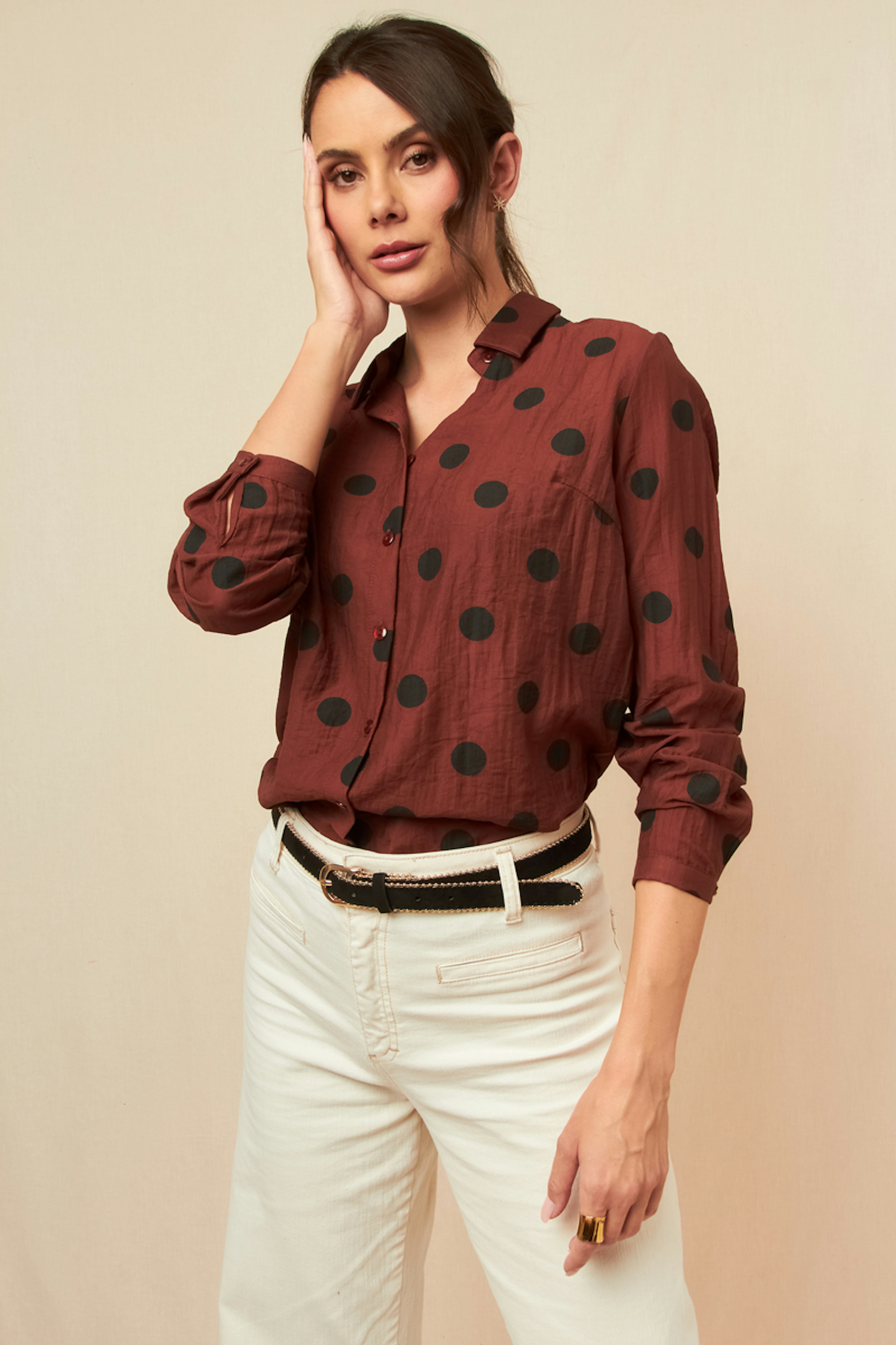 Portez cette chemise élégante avec un jean blanc pour un look chic et décontracté, parfait en toute saison. • Chemise à manches longues • Coupe ample et confortable • Col chemise classique • Motif à pois • Tissu léger et fluide