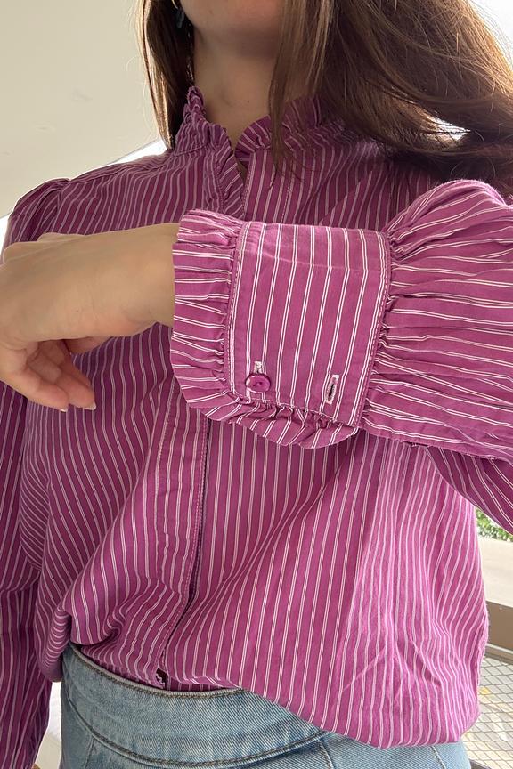 Pour un look sophistiqué et tendance, associez cette chemise à rayures avec un pantalon taille haute blanc et des escarpins nude. Parfaite pour les journées fraîches. • Chemise à rayures • Col Mao • Manches longues bouffantes • Fermeture à boutons cachée • Détail volanté à l'avant