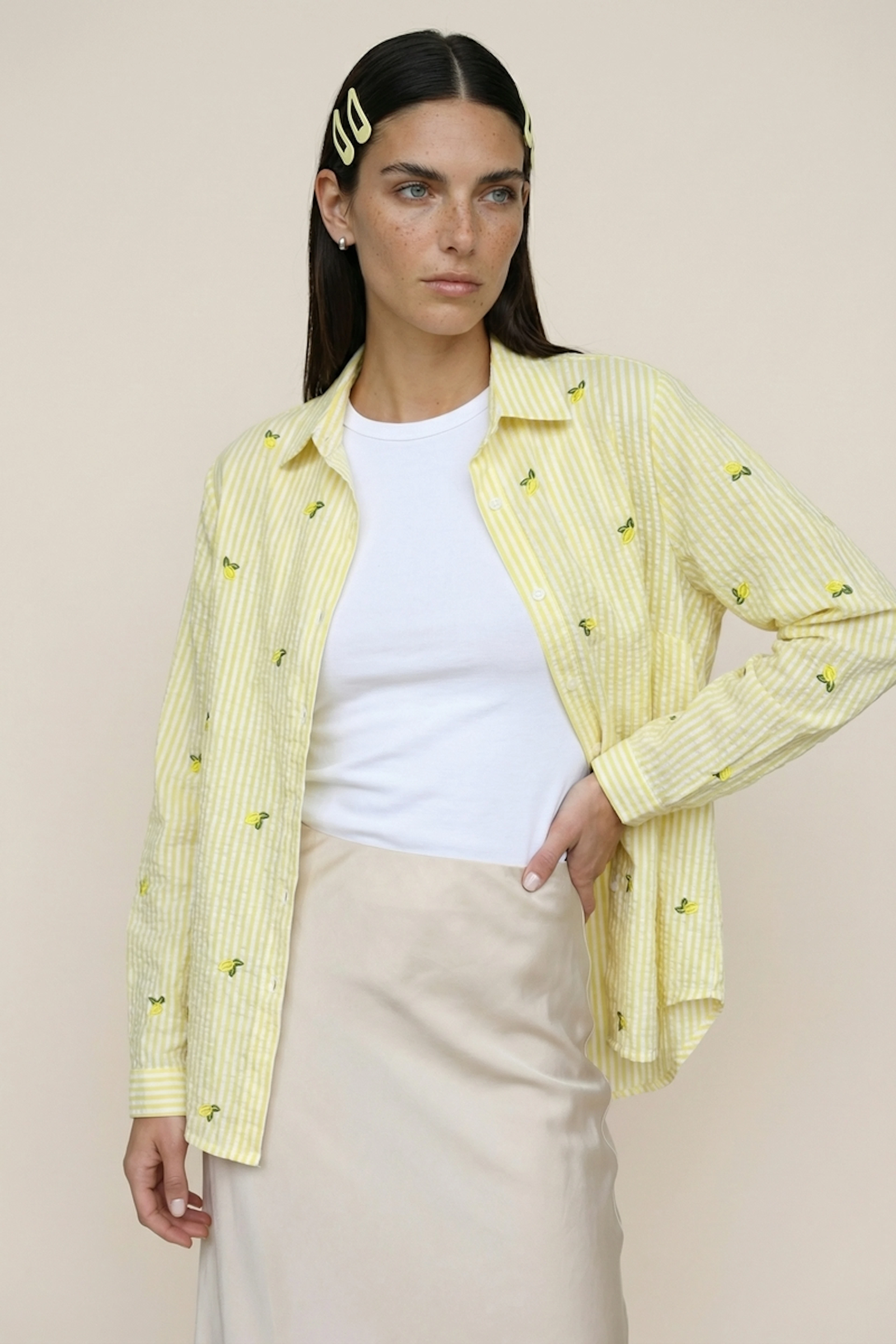 Ajoutez une touche de fraîcheur en la portant ouverte sur un t-shirt blanc et assortissez-la avec un jean clair pour un look décontracté. Parfaite pour l'été! • Chemise à rayures • Coupe droite • Manches longues • Col classique • Motif citron
