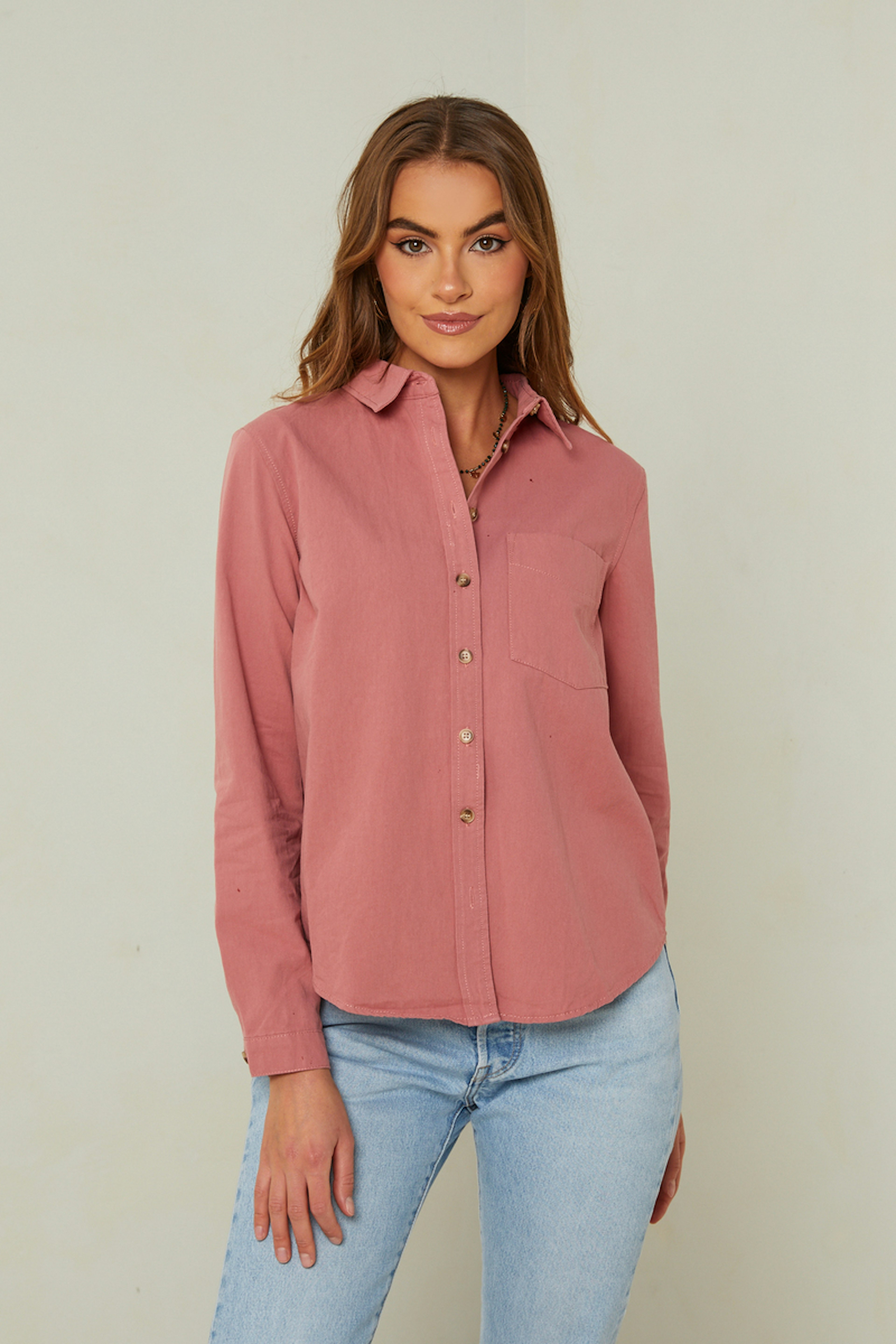 โข Chemise rose โข Manches longues โข Col chemise avec patte de boutonnage โข Poche plaquรฉe sur la poitrine ton sur ton โข Coupe droite classique