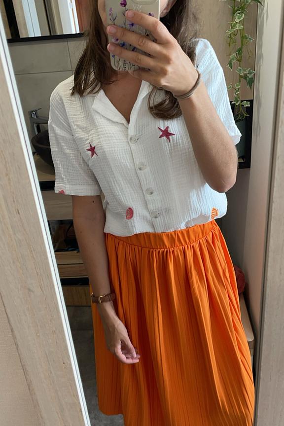 Associez cette chemise ร  un jean skinny pour un brunch estival, parfait pour toute saison. โ€ข Chemise en gaz de coton โ€ข Col en V โ€ข Manches courtes โ€ข Coupe rรฉguliรจre โ€ข Broderie marine
