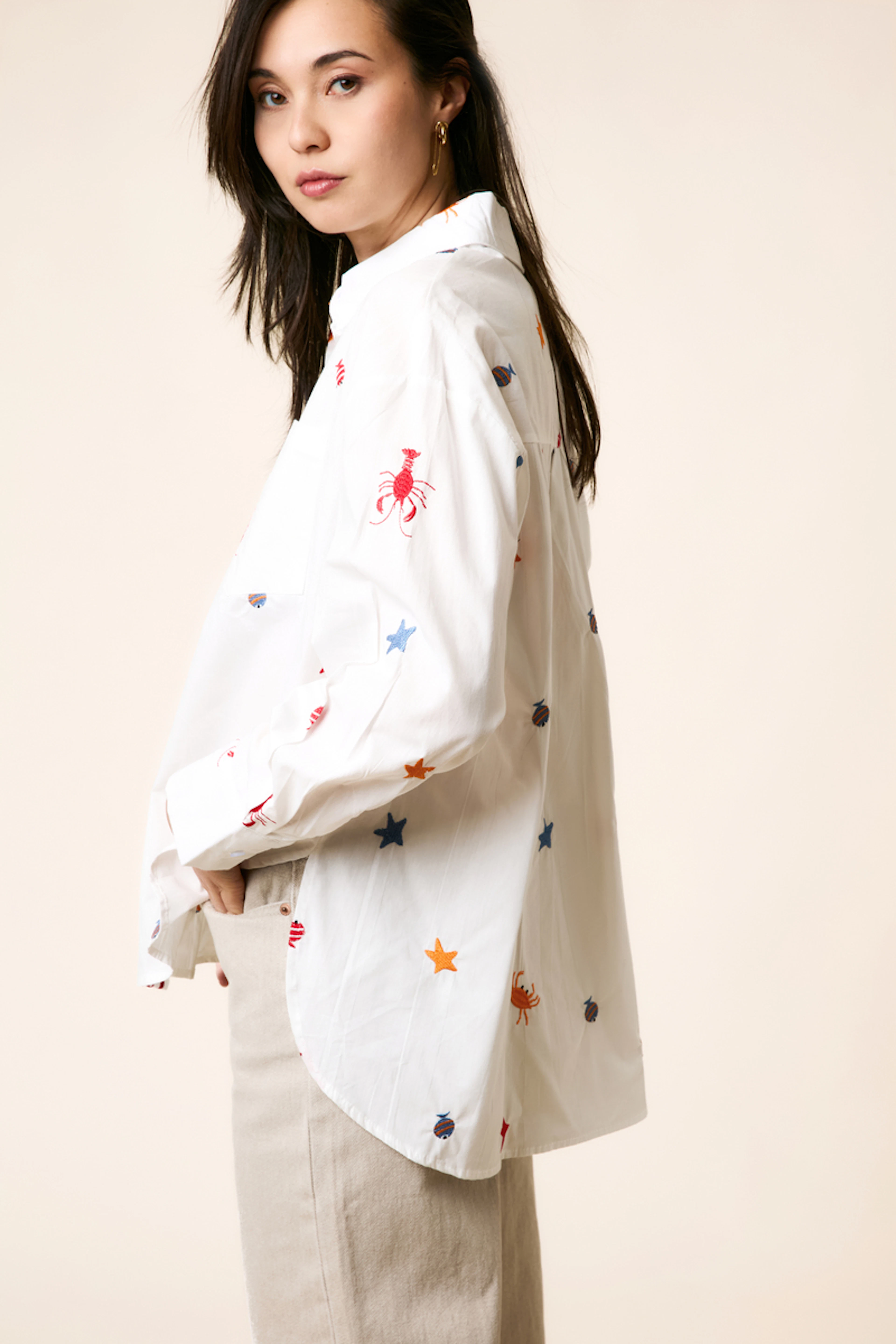 Pour une allure estivale décontractée, associez cette chemise à un jean clair et des sandales en cuir. Parfait pour profiter des longues journées d'été avec style. • Chemise en coton • Coupe ample • Col chemise • Imprimé ludique • Ourlet arrondi