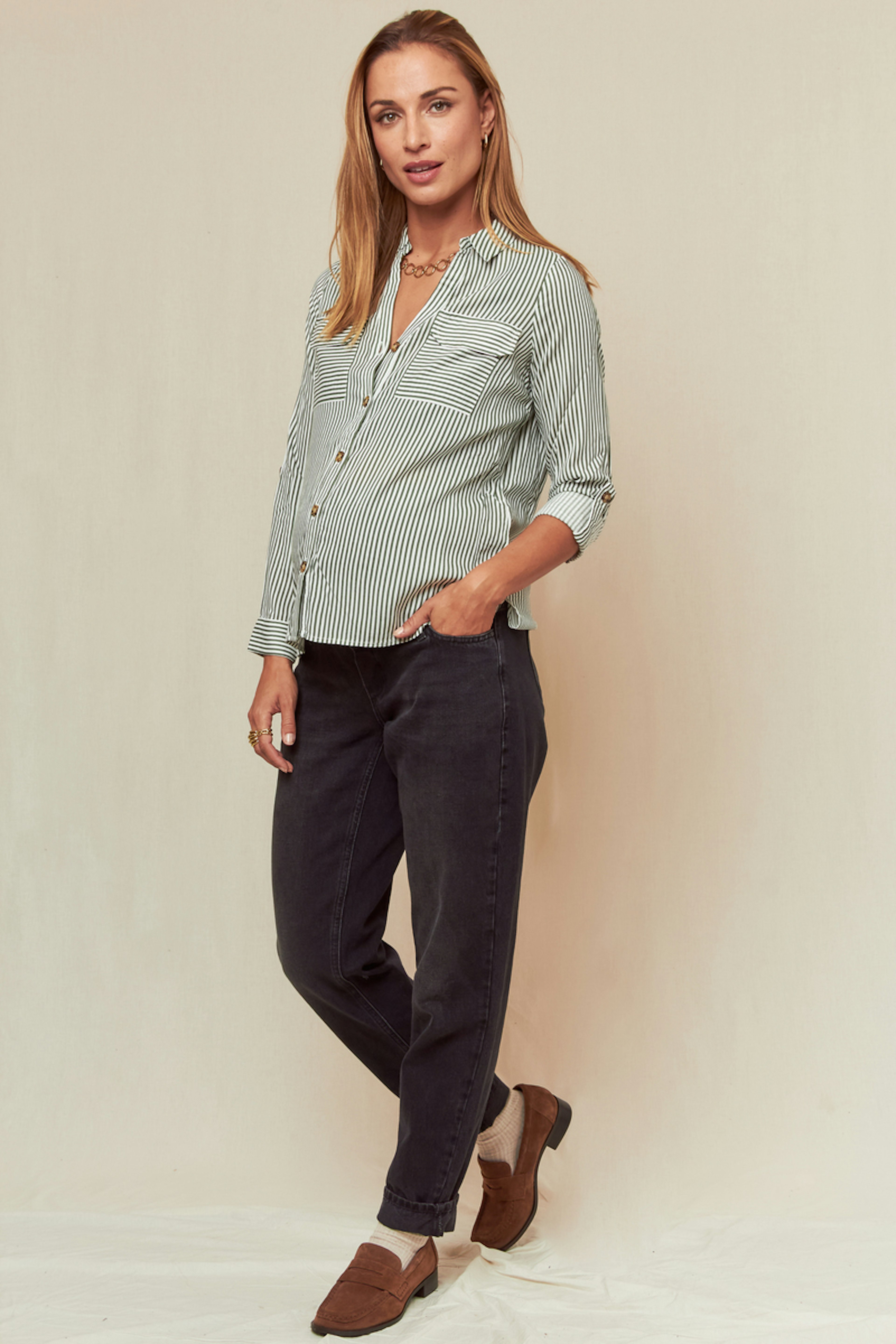 Associez cette chemise à un jean ajusté et des bottines pour un look chic en hiver. Ajoutez une écharpe en laine pour une touche cosy. • Chemise à manches longues • Coupe ajustée flatteuse • Col chemise classique • Poches à rabat à l'avant • Motif rayé élégant