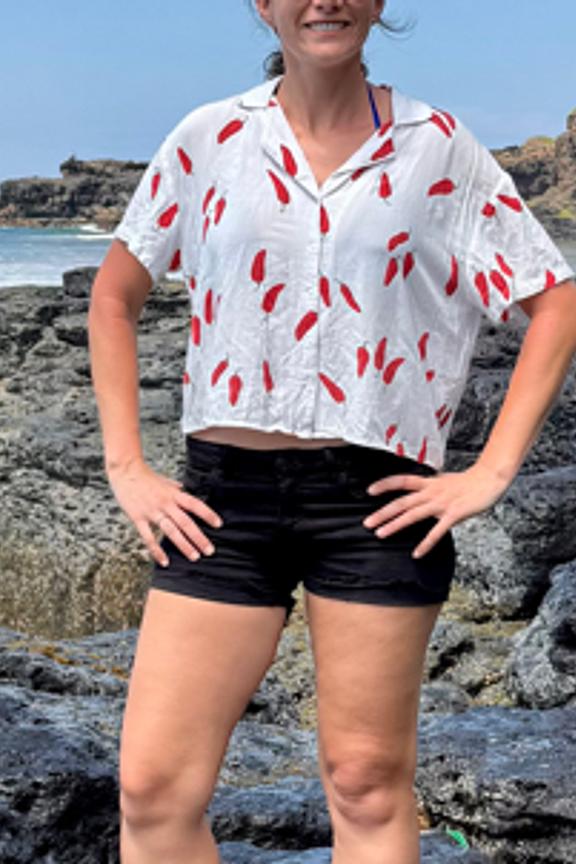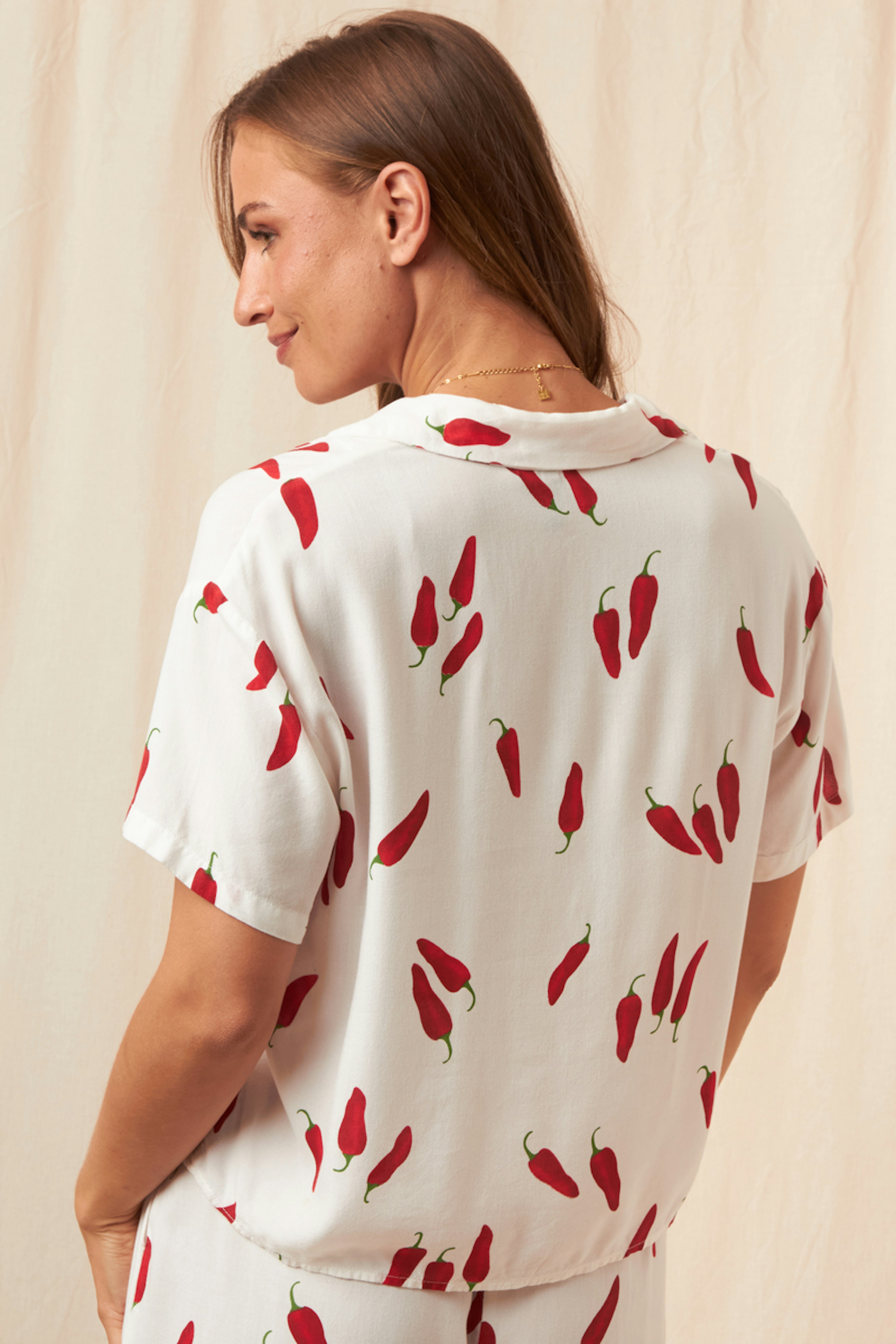 Portez cette chemise imprimée avec un short en denim et des sandales pour un look estival rafraîchissant et moderne. • Chemise ample en viscose éco-responsable • Manches courtes • Col en V • Fermeture à boutons • Motif piments rouges