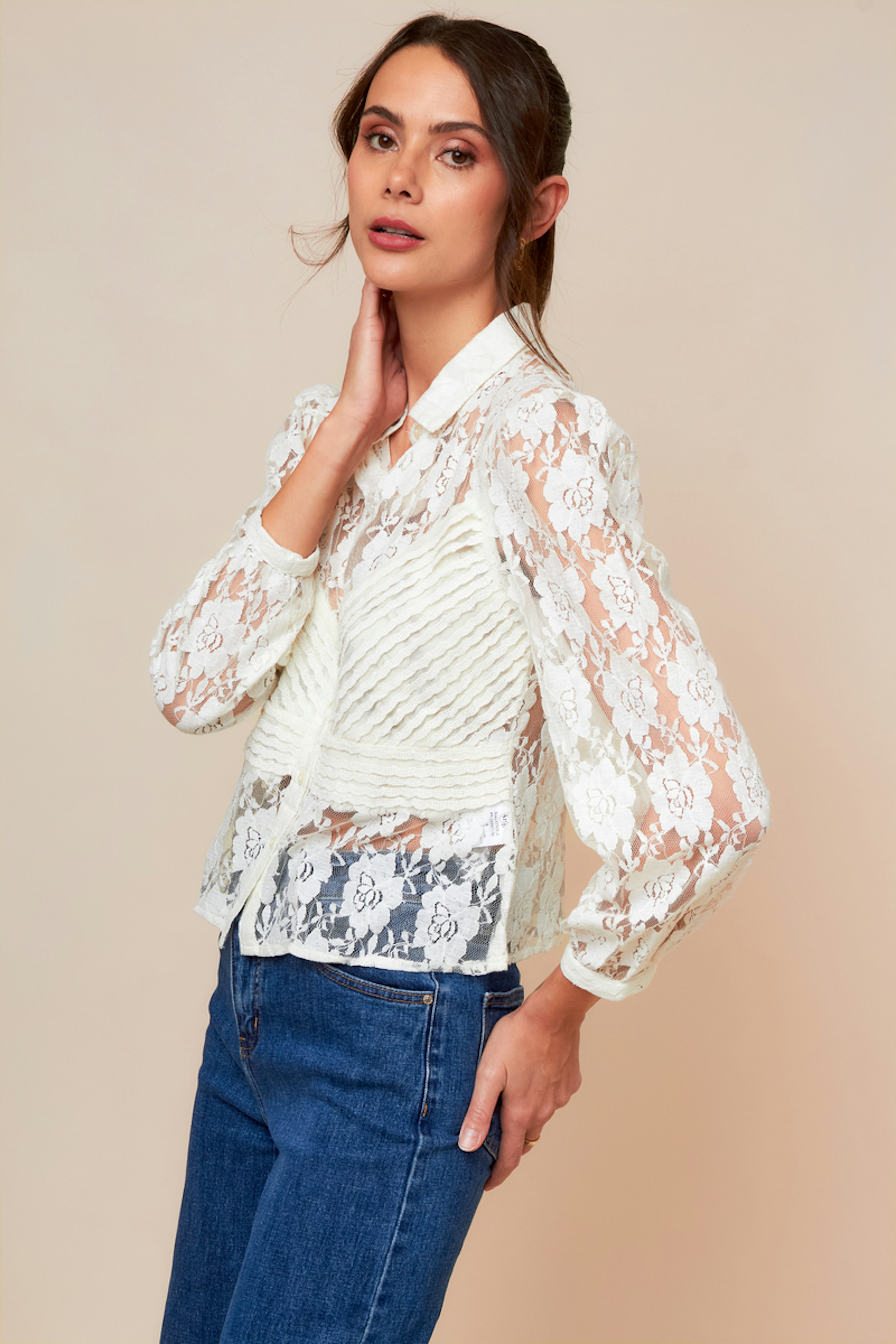 Associez ce chemisier délicat à un pantalon taille haute pour un look chic d'hiver. • Chemise en dentelle • Col chemise classique • Manches longues • Finitions boutonnées • Motif floral délicat