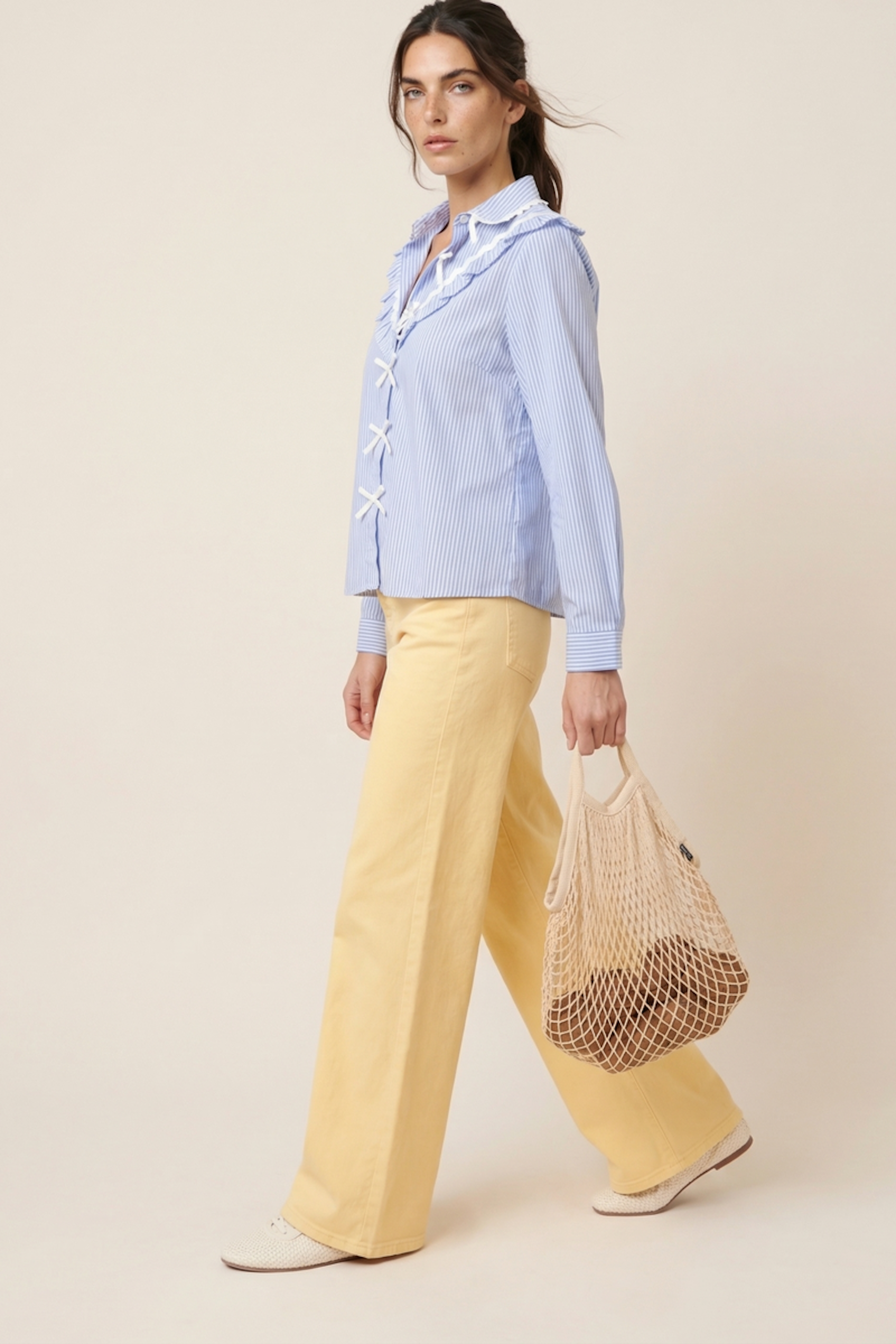 Portez cette chemise à rayures avec un jean blanc et des sandales en cuir pour une allure estivale chic. • Chemise 100% coton • Rayures délicates • Volants élégants • Col chemise structuré • Détails croisés élégants
