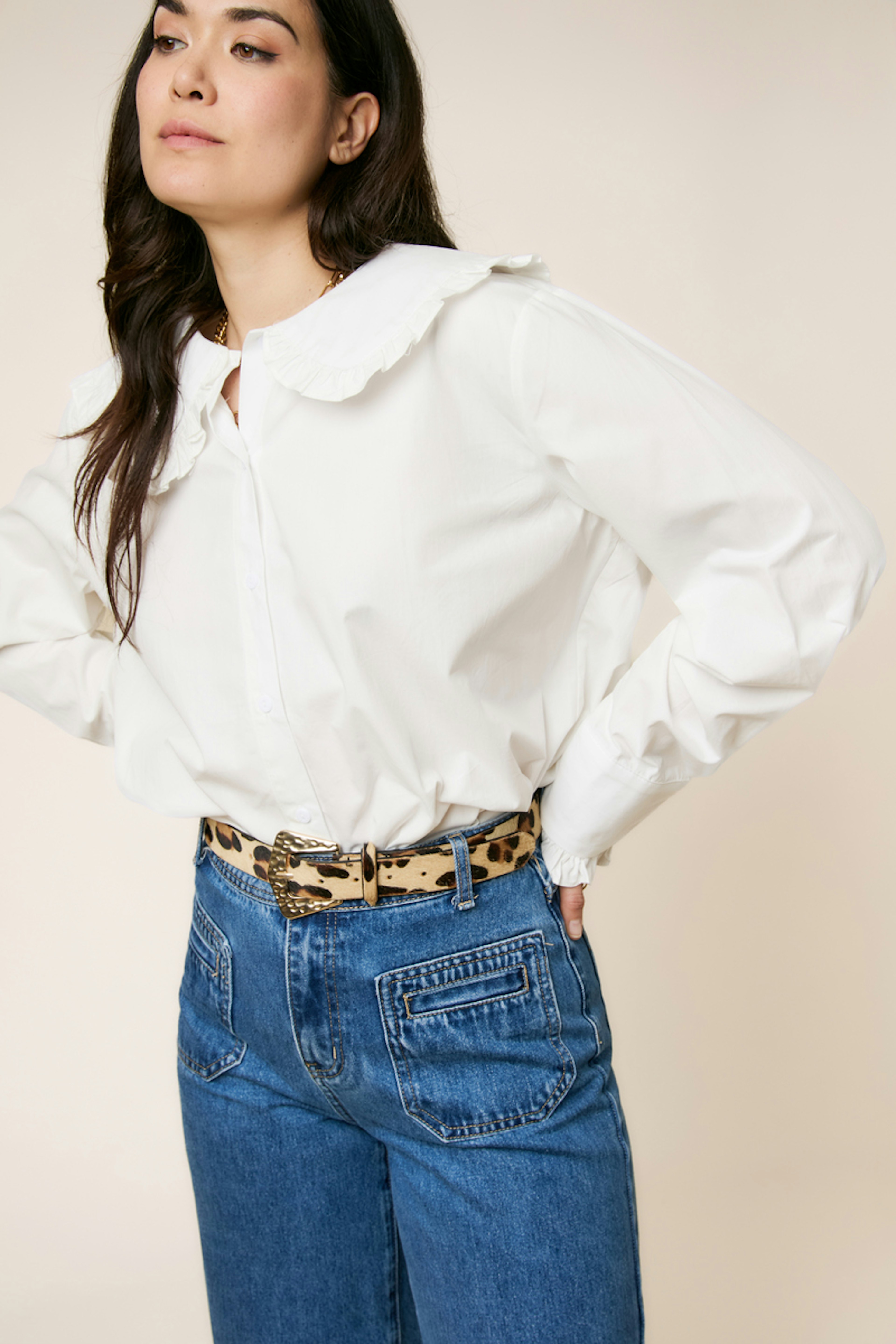 Assortissez cette élégante chemise avec un pantalon à pince chic pour un look sophistiqué d'hiver. • Chemise en coton • Col rond à volants • Manches longues • Fermeture boutonnée devant • Poignets à volants