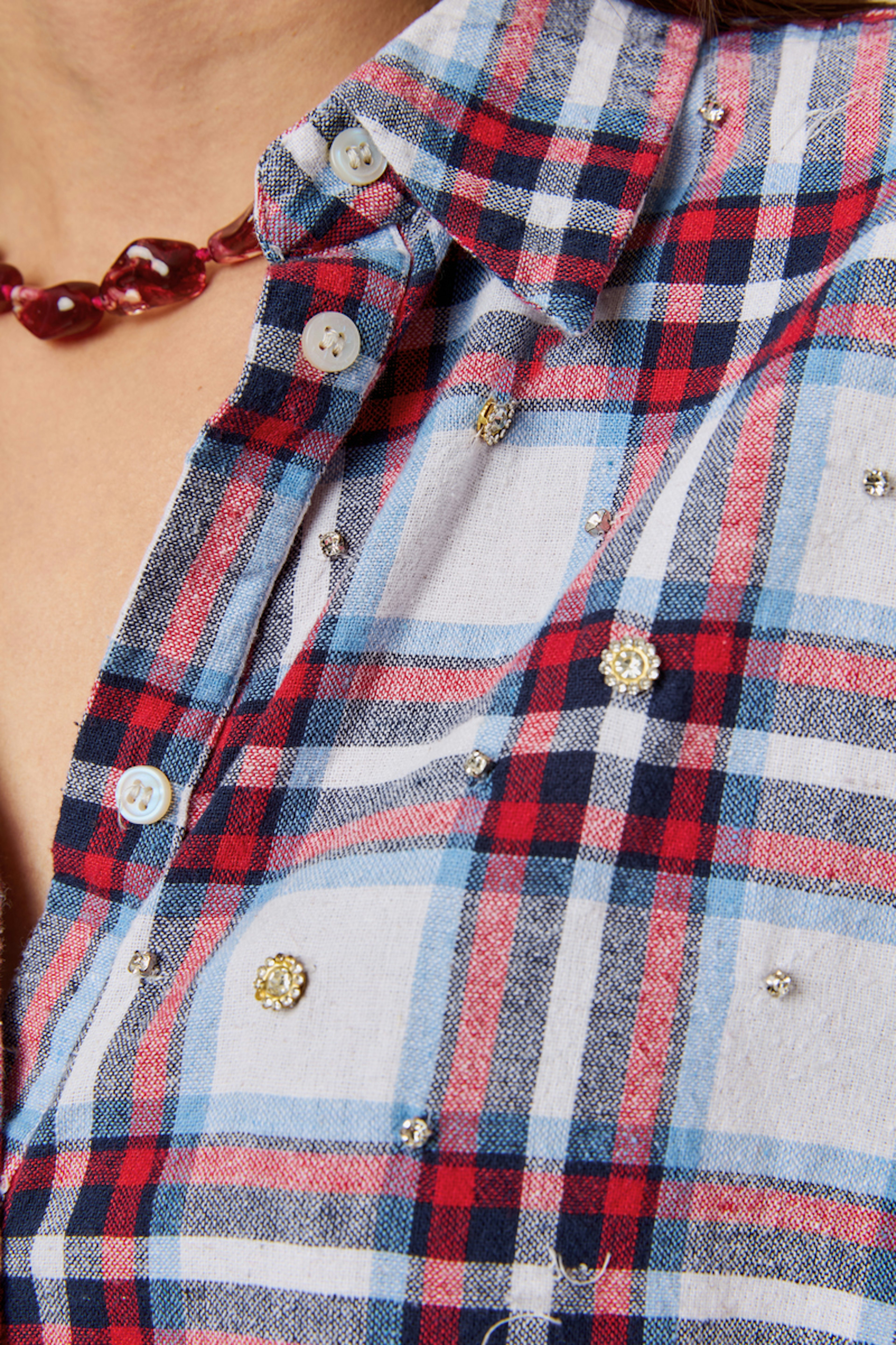 Portez cette chemise avec un jean brut et des bottines pour un look hivernal décontracté mais raffiné. Idéale pour les journées fraîches. • Chemise en coton • Coupe classique • Col chemise • Manches longues • Motif à carreaux avec détails brillants
