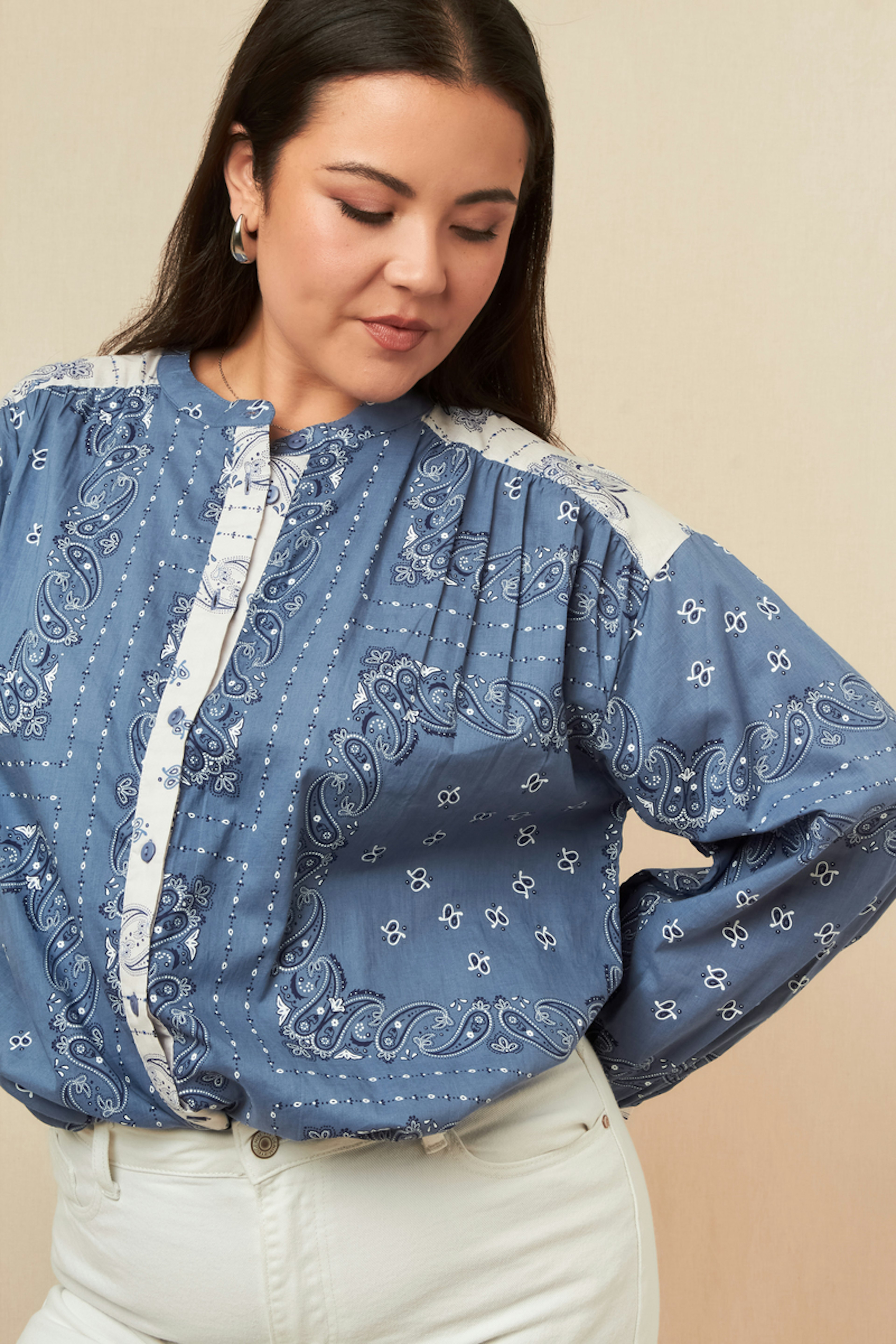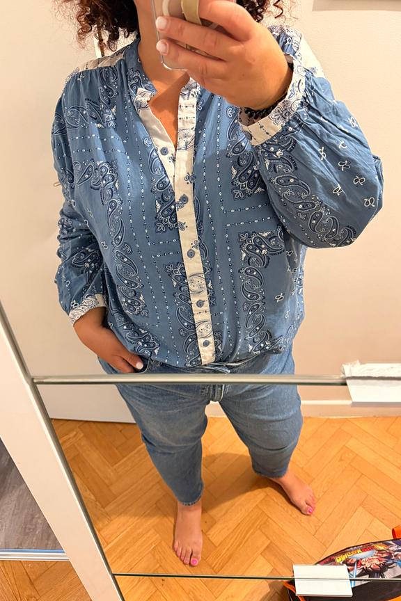 Associez cette chemise imprimée avec un pantalon blanc ajusté et des mocassins pour une touche chic. Parfaite pour toute saison. • Chemise en coton • Coupe fluide • Manches longues • Col Mao • Imprimé paisley