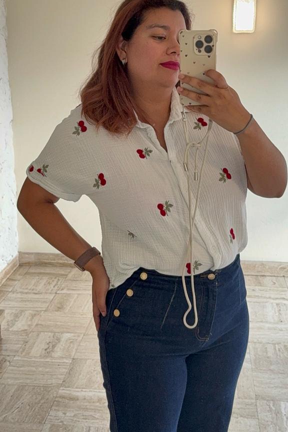 Adoptez un look estival irrésistible avec cette chemise légère en coton brodée de cerises. Associez-la à une jupe en jean et des sandales pour une allure décontractée mais élégante. • Chemise en coton • Col chemise classique • Manche courte décontractée • Boutons discrets • Motif cerises brodées