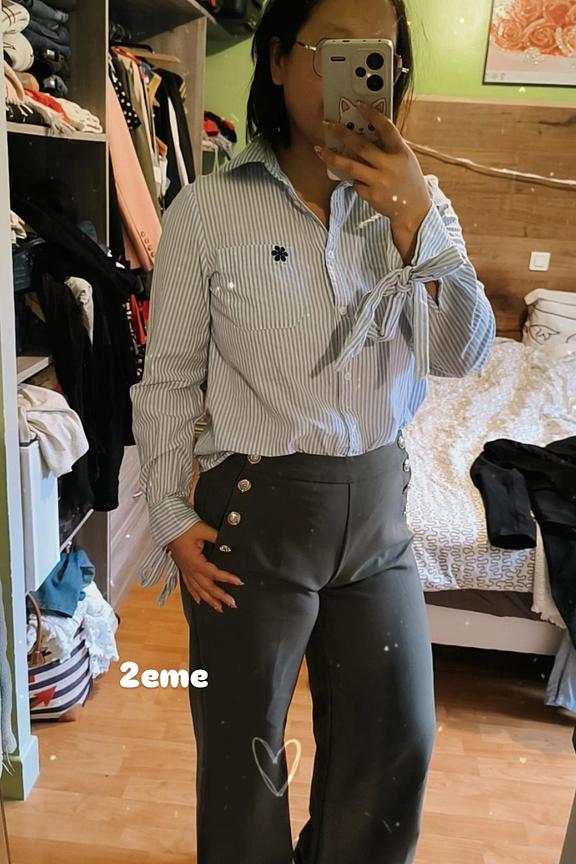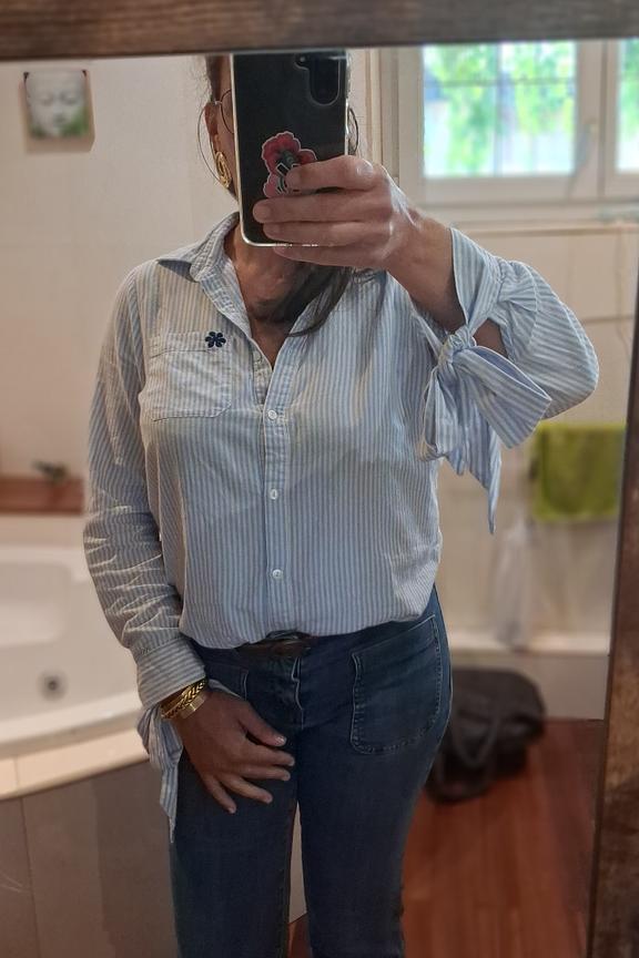 Associez cette chemise à un pantalon noir élégant et des escarpins pour un look chic et raffiné. Parfait en toute saison. • Chemise en coton • Manches longues avec nœuds • Col chemise classique • Rayures verticales • Motif floral brodé