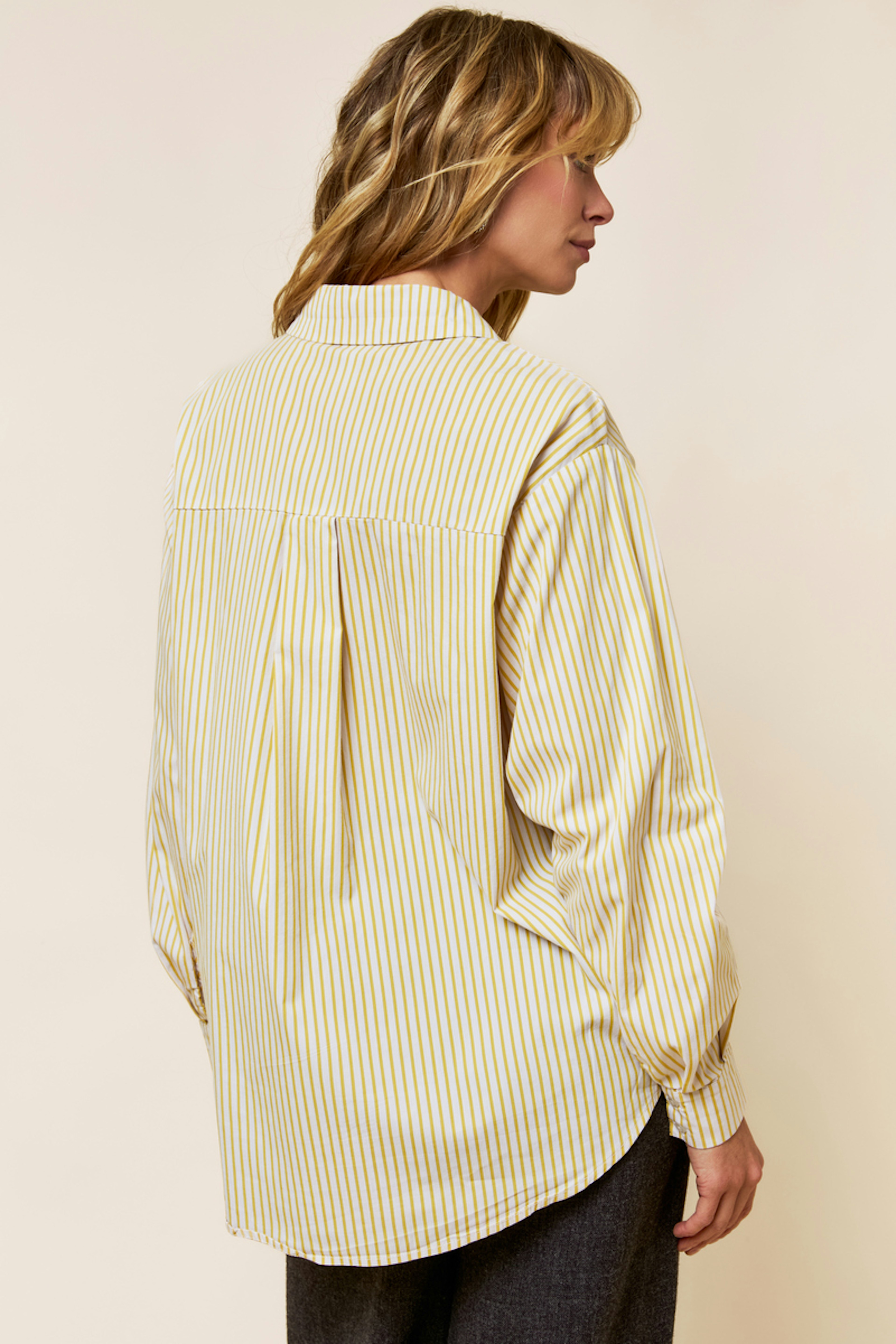 Associez cette chemise rayée à un pantalon élégant et des bottines pour un look chic en hiver. • Chemise rayée • Manches longues • Fermeture boutonnée • Col chemise • Rayures verticales