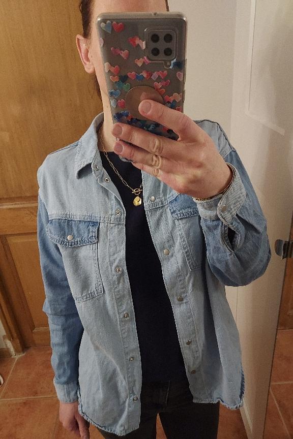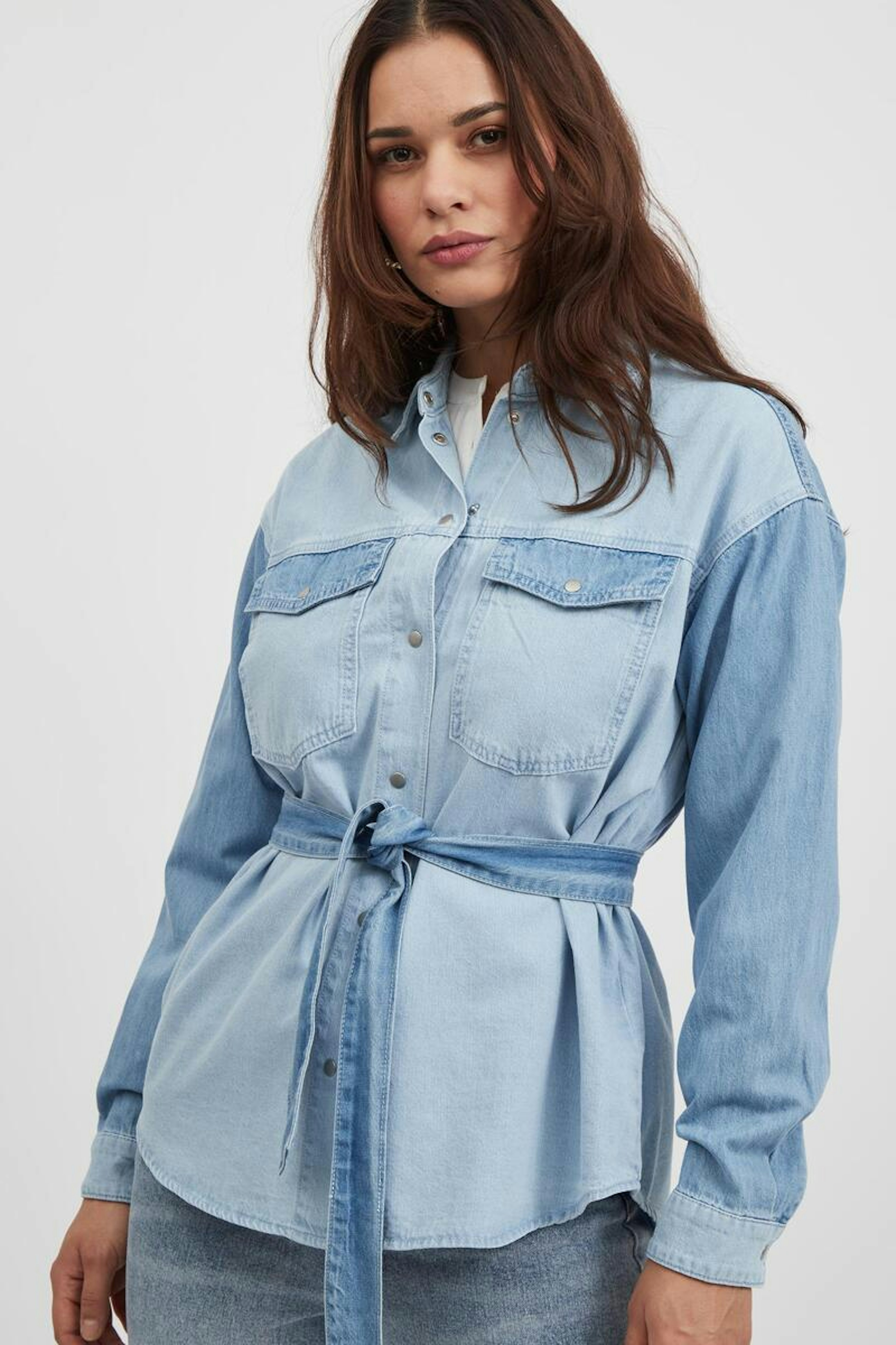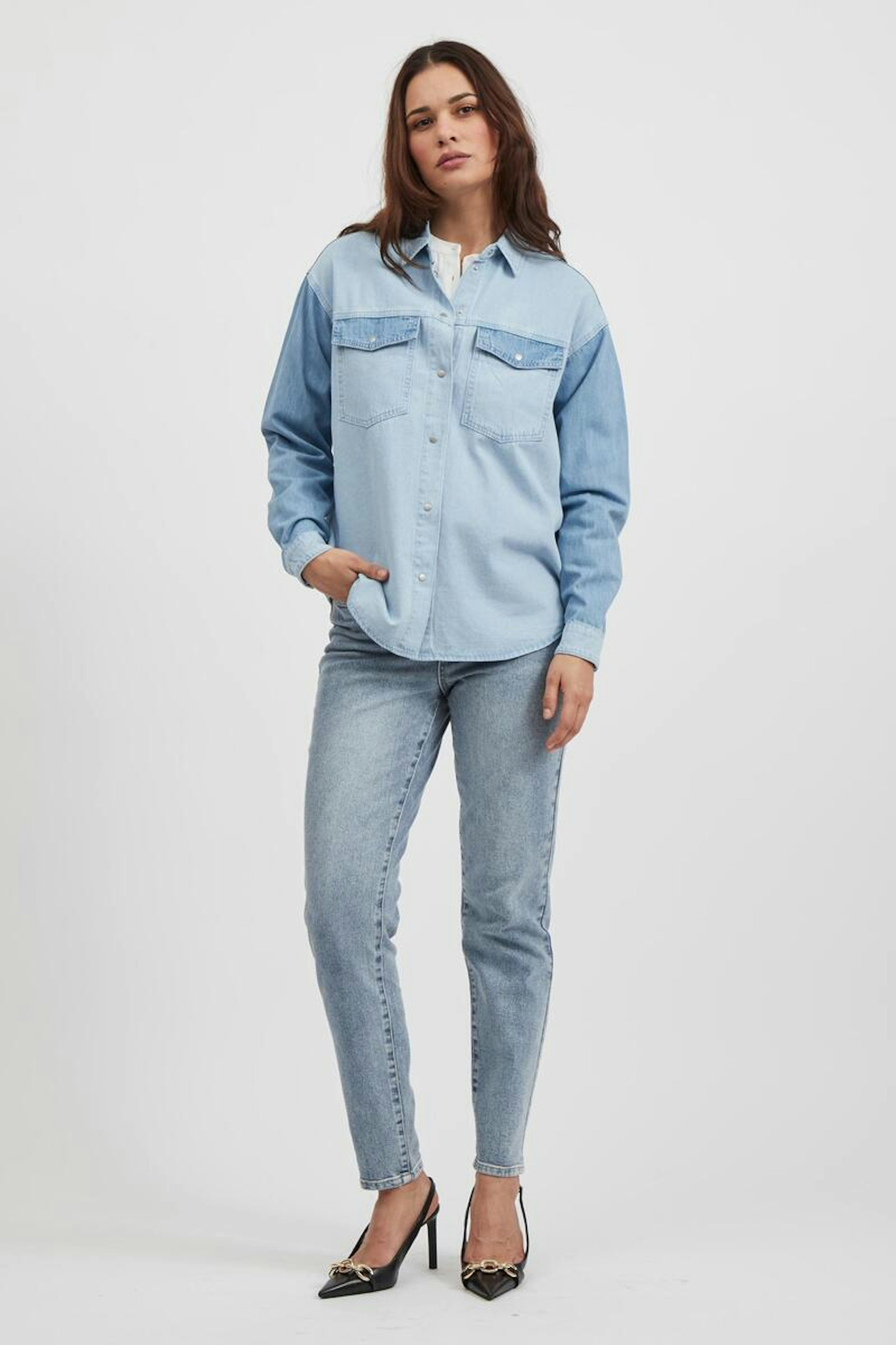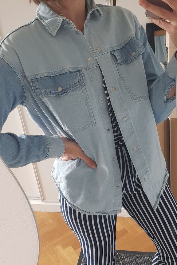 Optez pour cette chemise en denim bicolore ultra tendance qui apportera du caractรจre ร toutes vos tenues. โข Chemise en denim โข Se porte รฉgalement en surchemise โข Bicolore : dรฉlavages moyen et clair โข Deux poches plaquรฉes ร l'avant โข Boutons pression โข Coupe lรฉgรจrement oversize